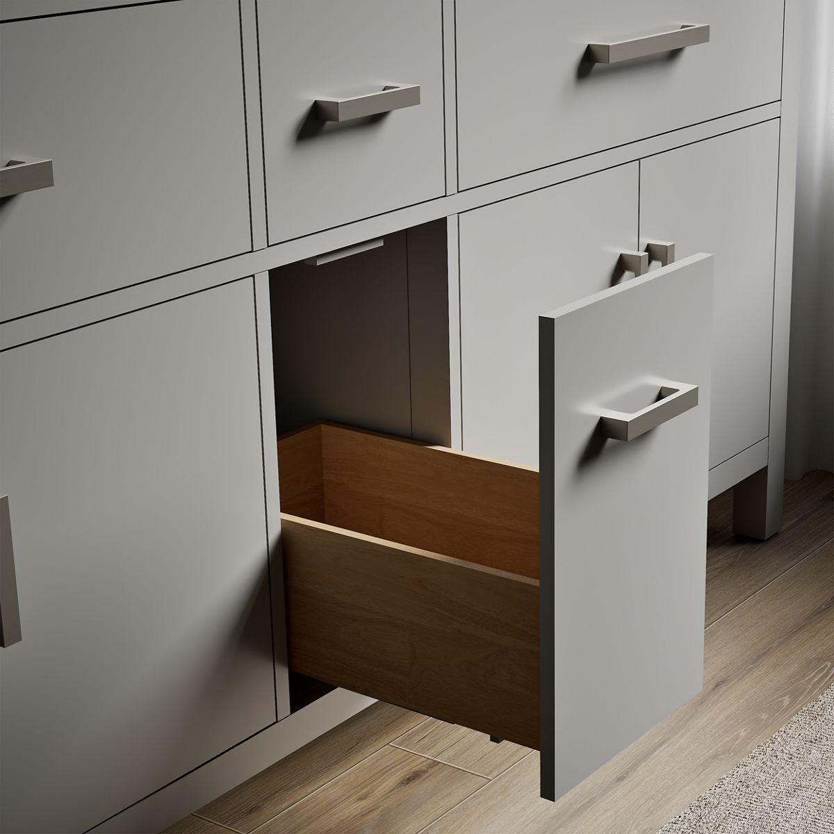 - Brushed Nickel hardware included on White, Atmos Grey, and Carbon Oak vanities, and Matte Black hardware on Light Oak vanities.