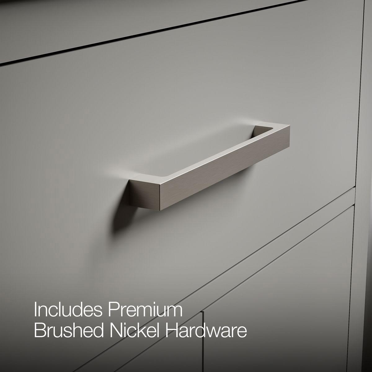 - Brushed Nickel hardware included on White, Atmos Grey, and Black Oak vanities, and Matte Black hardware on Light Oak vanities.