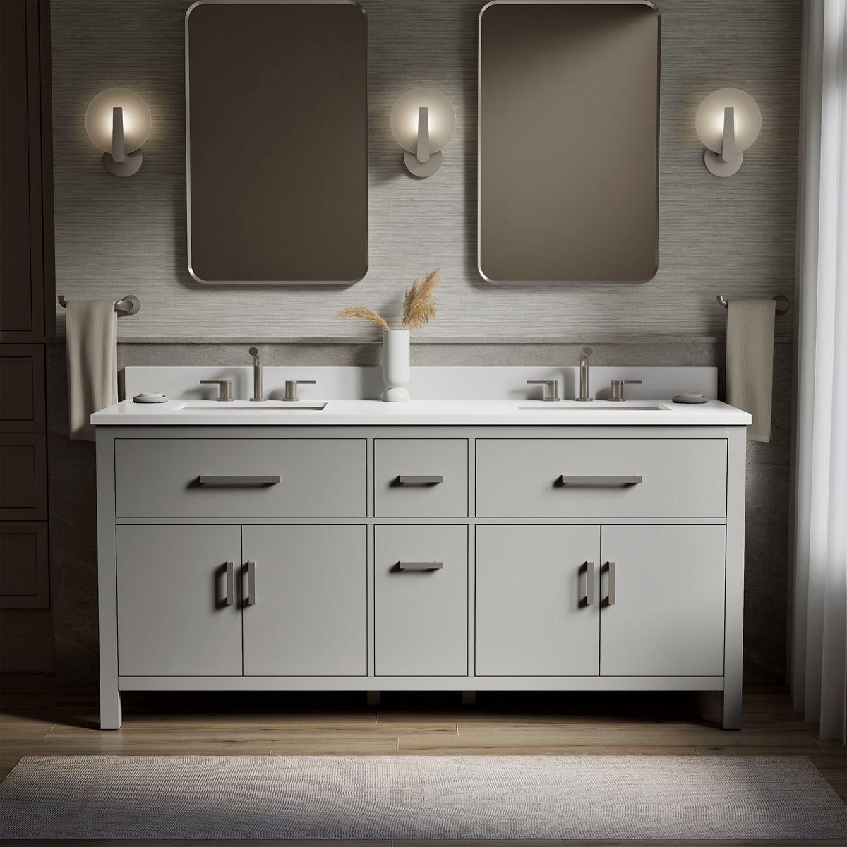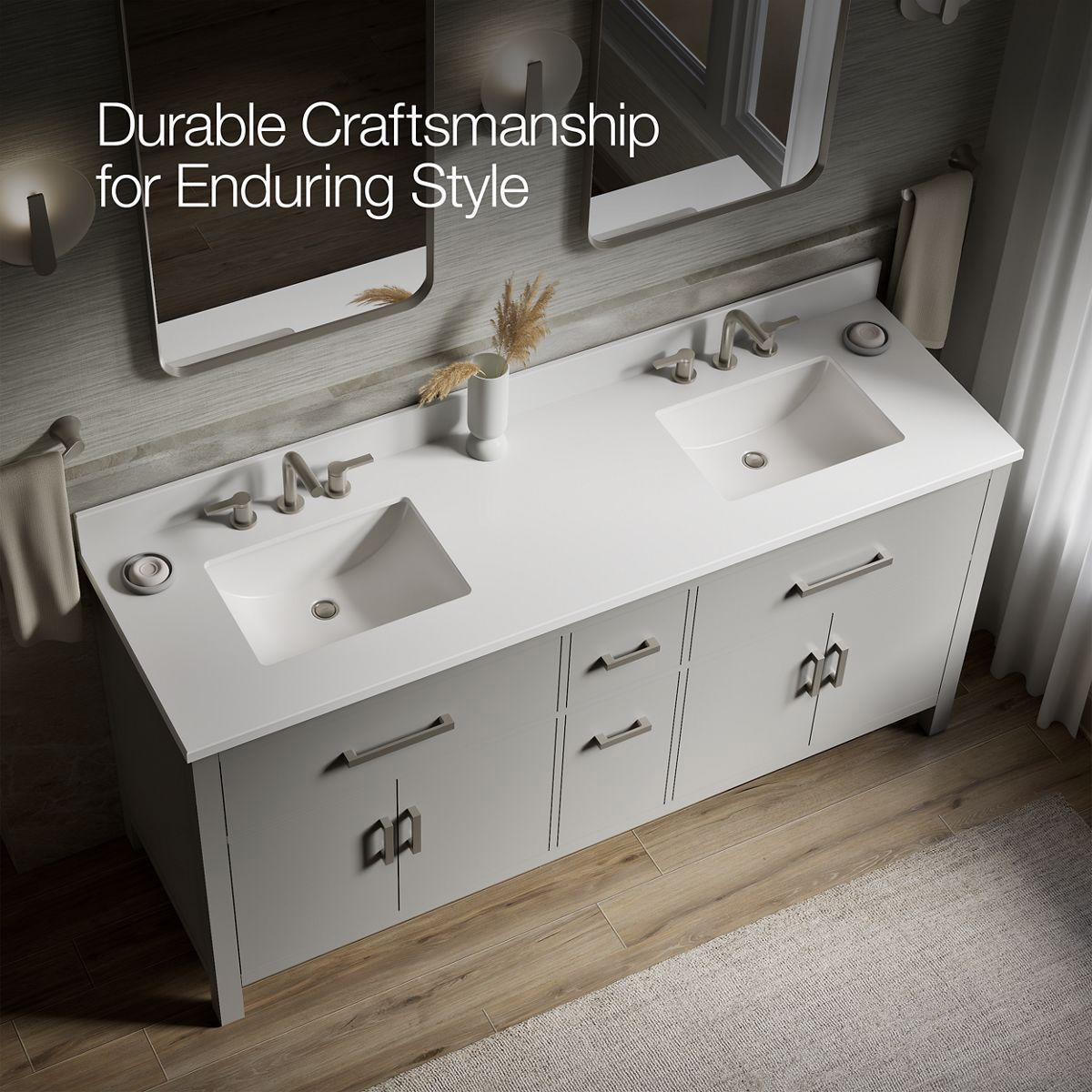The Kresla vanity collection brings a quiet sophistication into your bathroom space with its with clean, architectural lines and range of finishes, and with its roomy interior, you'll find ample storage space to keep your bathroom organized and clutter-free. The Kresla 72" vanity set includes cabinet, quartz countertop with matching backsplash, two sinks, and hardware. With KOHLER, it’s easy to find the design solution that’s right for you.
