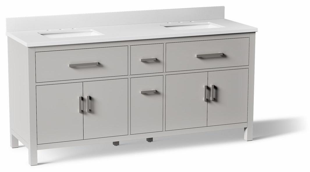 - Set includes cabinet, precut quartz vanity top, backsplash, sinks, cabinet hardware