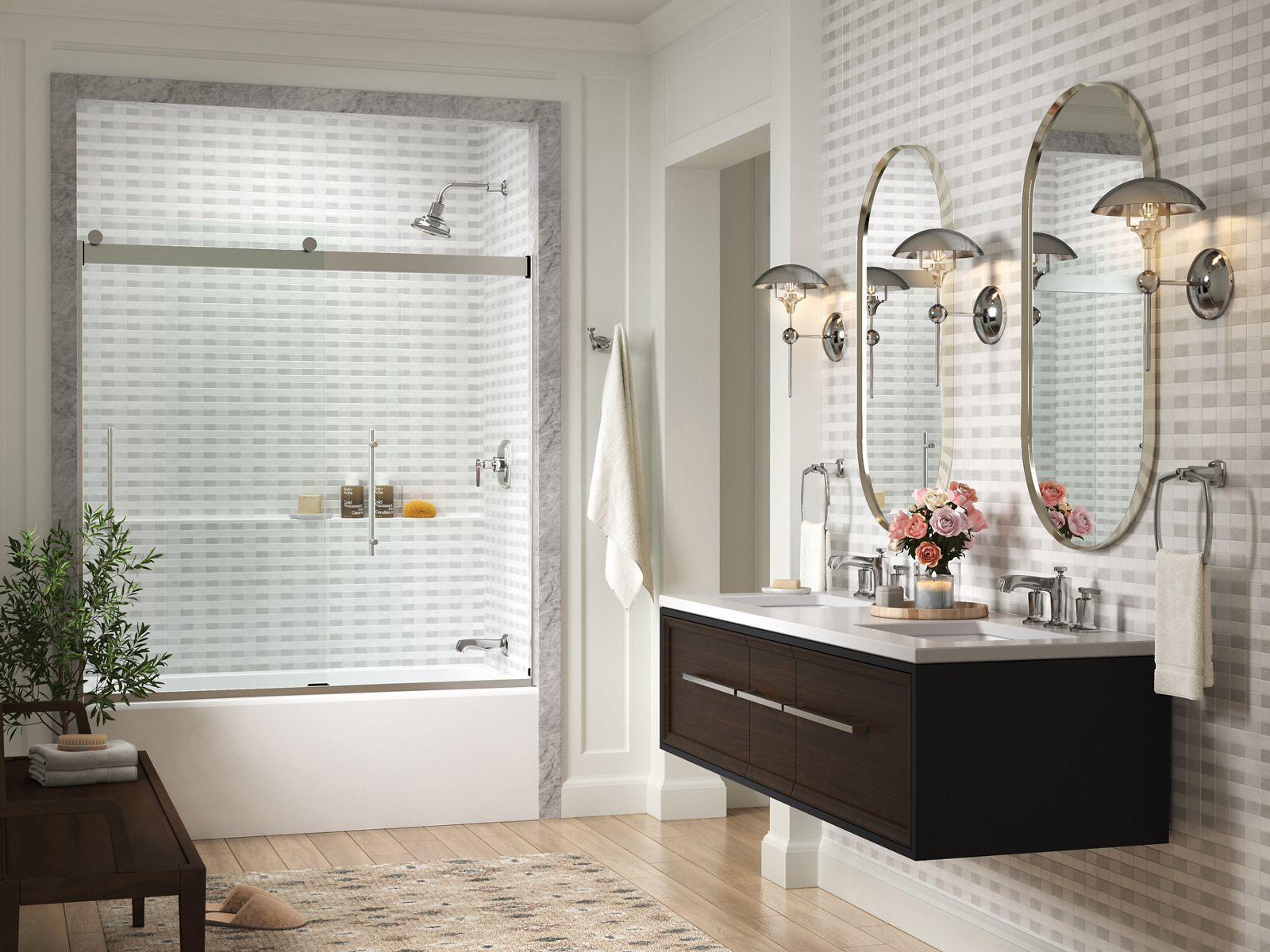Bringing new technology and sleek style to the contemporary bathroom, Levity Plus bath doors feature an innovative roller design that provides an amazingly smooth, quiet sliding action for a difference you can feel. Fully bypassable glass panels make installation easier than ever and allow for adjustability while the door is hanging. Vertical blade handles complement the modern minimalist look, creating an open, inviting space. Premium 3/8"-thick Crystal Clear glass offers a luxurious feel.