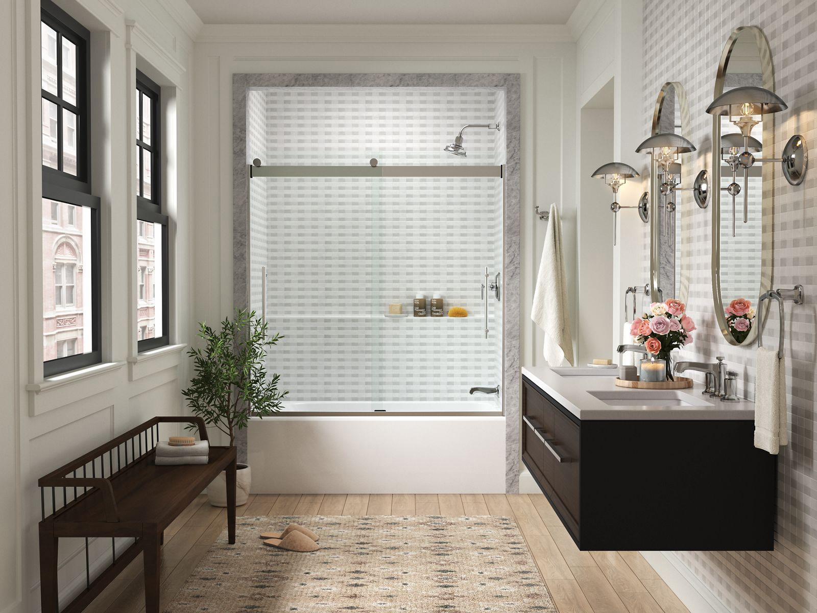Bringing new technology and sleek style to the contemporary bathroom, Levity Plus bath doors feature an innovative roller design that provides an amazingly smooth, quiet sliding action for a difference you can feel. Fully bypassable glass panels make installation easier than ever and allow for adjustability while the door is hanging. Vertical blade handles complement the modern minimalist look, creating an open, inviting space. Premium 3/8"-thick Crystal Clear glass offers a luxurious feel.