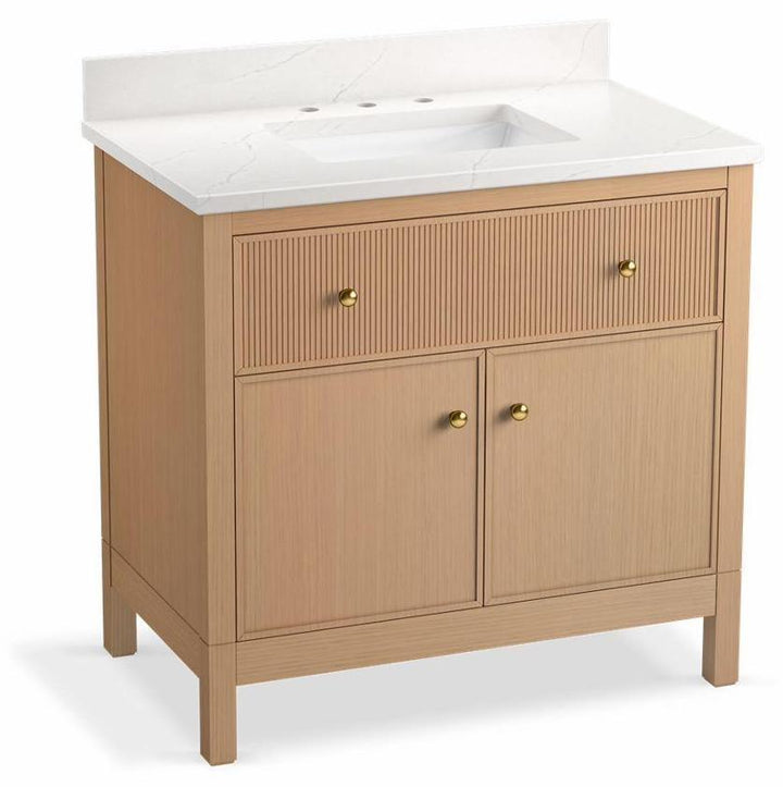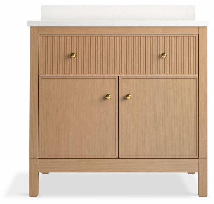 - Set includes cabinet, precut quartz vanity top, backsplash, sink, cabinet hardware