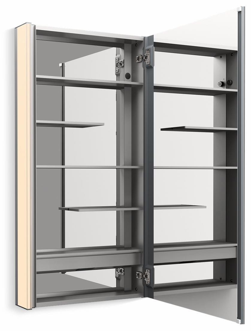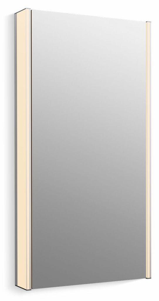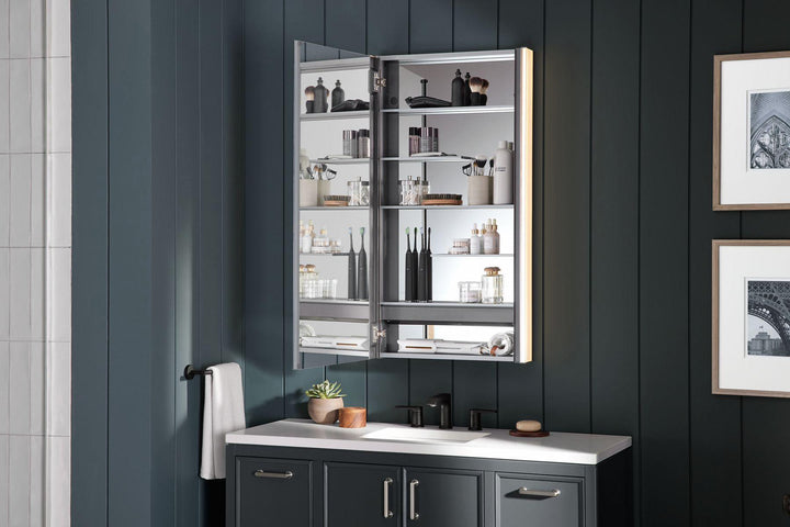 Innovate your vanity space and maximize your bathroom style and storage with the Maxstow 22" W x 40" H lighted medicine cabinet, featuring exterior LED lighting, an interior electrical outlet, and the ability to attach a coordinating Moxie speaker charging dock (sold separately). Staggered shelving holds tall and short items with no wasted space, while interior-door and back-panel mirrors provide reflection whether the doors is open or closed. The slim 3½"-deep design provides the same internal storage space as traditional 5"-deep cabinets. Installation is fast and easy right out of the box—simply screw to the wall.