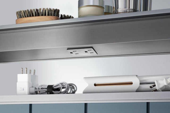 - Internal shelf features electrical outlet for powering small devices such as toothbrushes or razors.