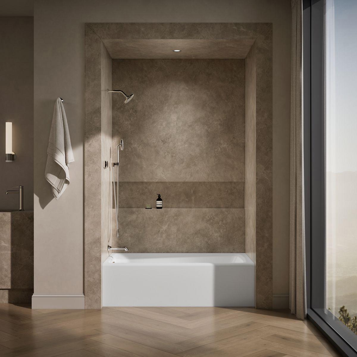 This Mendota bath offers the convenience of alcove installation with an integral apron and the durable beauty of KOHLER enameled cast iron. Available in a palette of KOHLER colors, this straightforward design is a complement to any decor. Safeguard slip-resistant surface enhances safety.