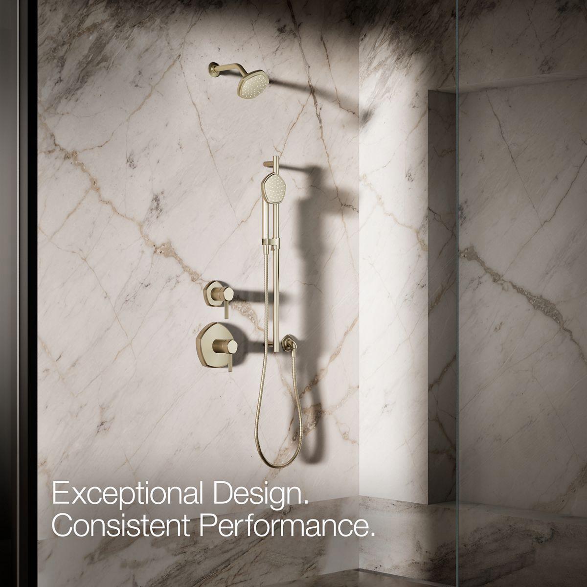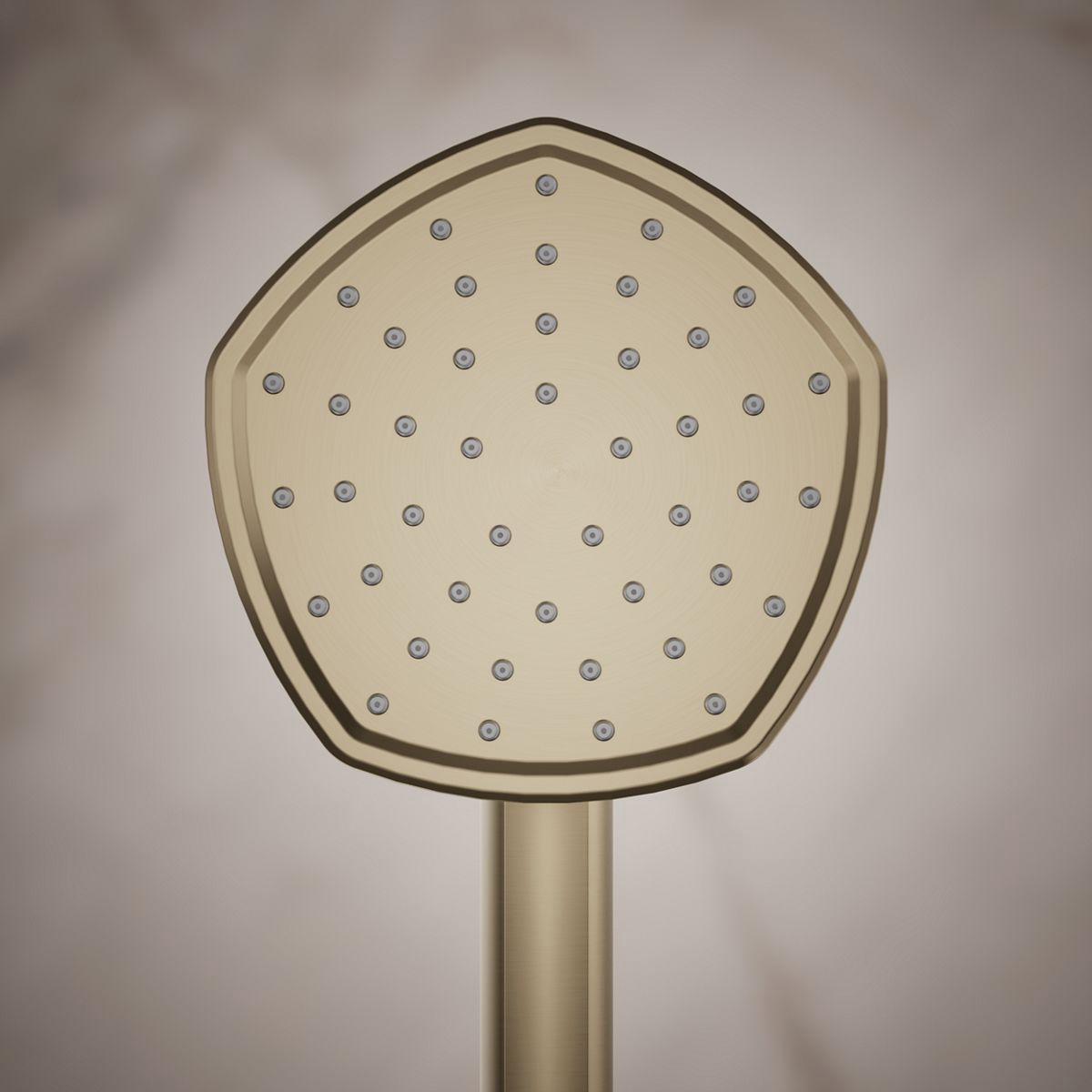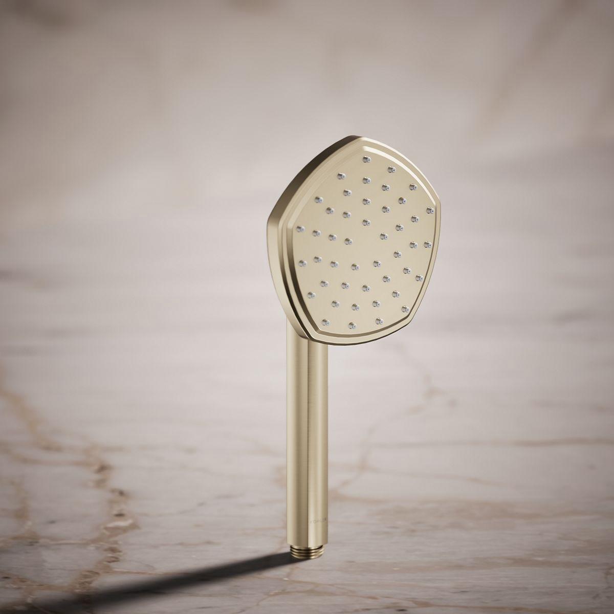 Unapologetically luxurious and truly unforgettable, Occasion bathroom faucets and accessories draw inspiration from 1960s Hollywood glamour and extravagance. Fashioned after the era’s sleek dress lines and bold car designs, the Occasion collection reflects graceful elegance with distinctive pentagonal accents, faceted bases, flowing lines, and delicate edges. Blending classic design with modern details, the pentagon-shaped single-function Occasion handshower features 45 nozzles and a Full Coverage with Katalyst spray experience for a shower as indulgent as it is fashionable—all while conserving water. Pair with coordinating handshower holder, showerhead, and other accessories to create your signature bathroom design.