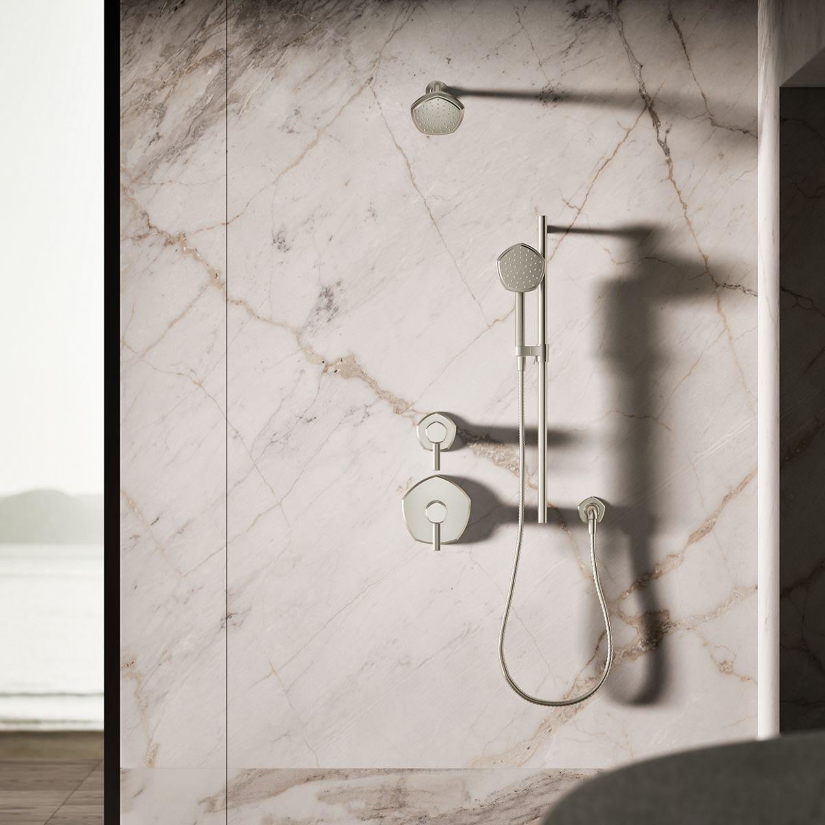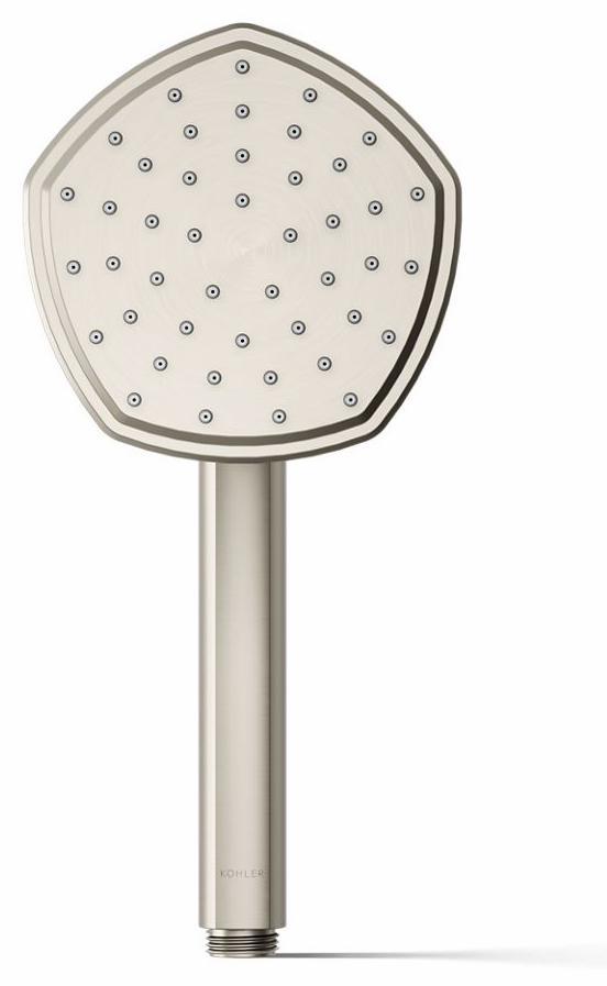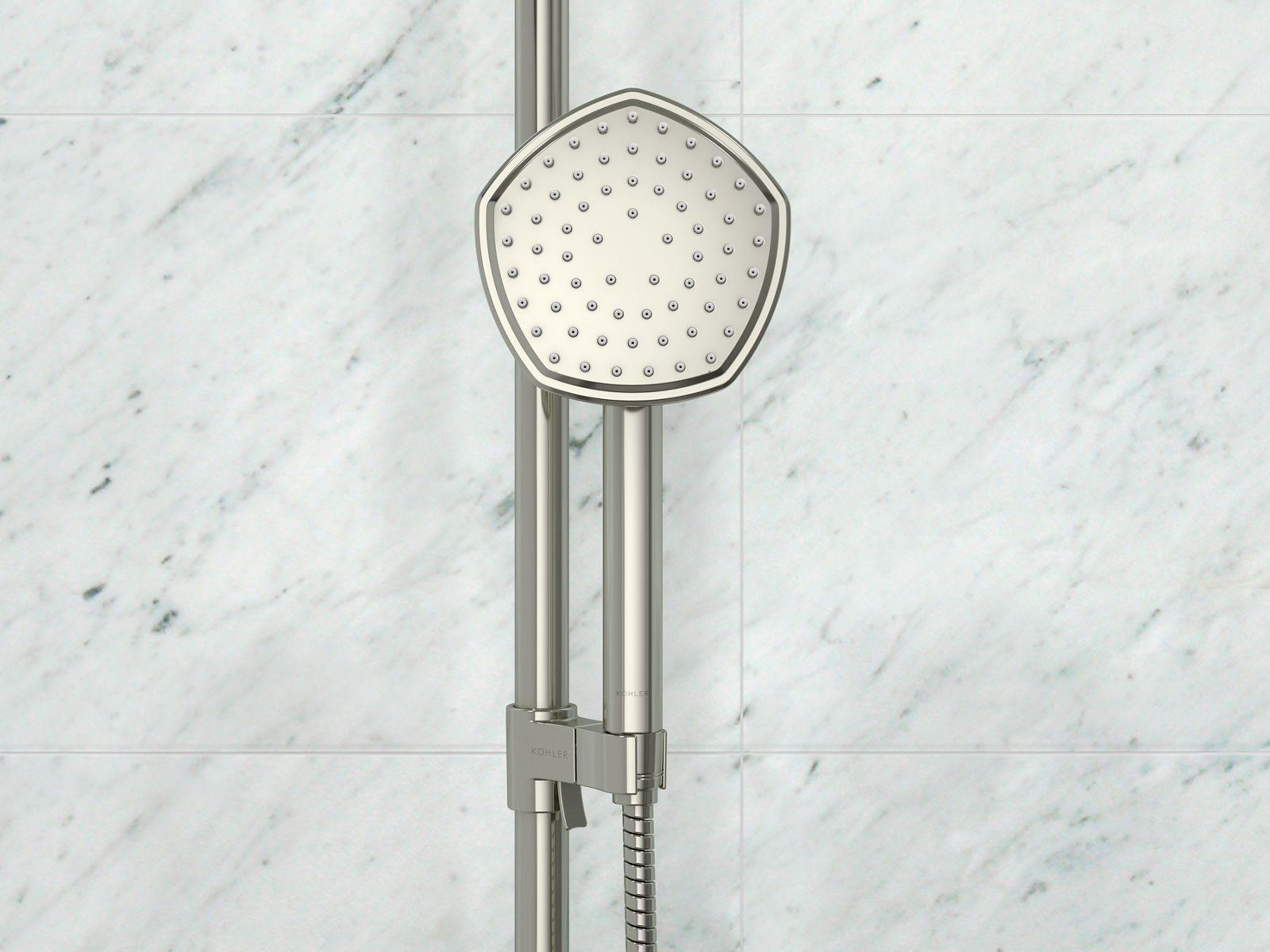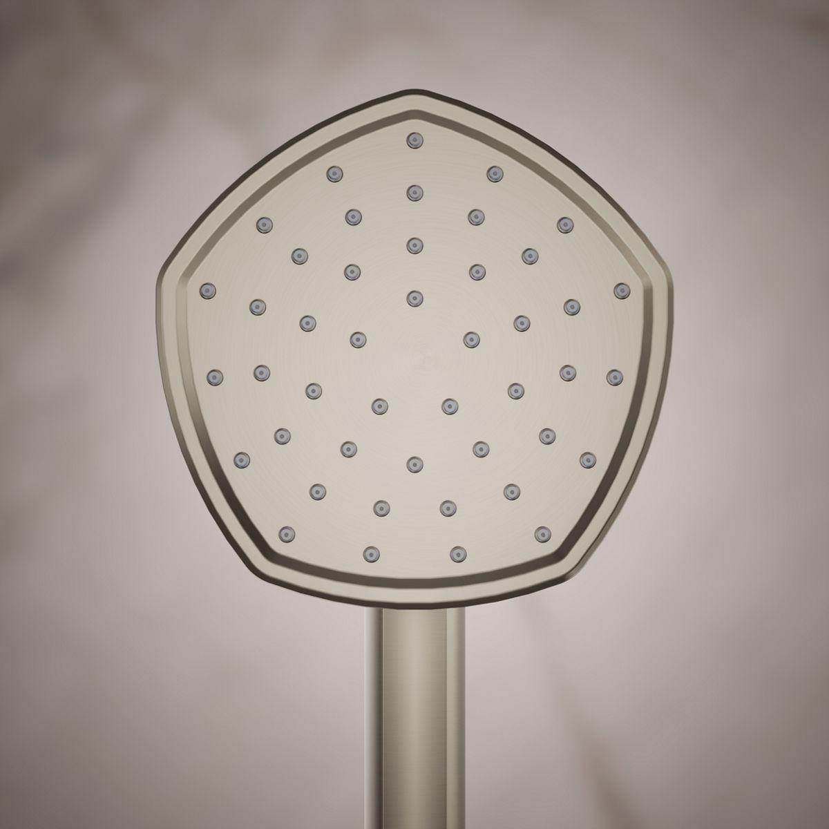 Unapologetically luxurious and truly unforgettable, Occasion bathroom faucets and accessories draw inspiration from 1960s Hollywood glamour and extravagance. Fashioned after the era’s sleek dress lines and bold car designs, the Occasion collection reflects graceful elegance with distinctive pentagonal accents, faceted bases, flowing lines, and delicate edges. Blending classic design with modern details, the pentagon-shaped single-function Occasion handshower features 45 nozzles and a Full Coverage with Katalyst spray experience for a shower as indulgent as it is fashionable—all while conserving water. Pair with coordinating handshower holder, showerhead, and other accessories to create your signature bathroom design.