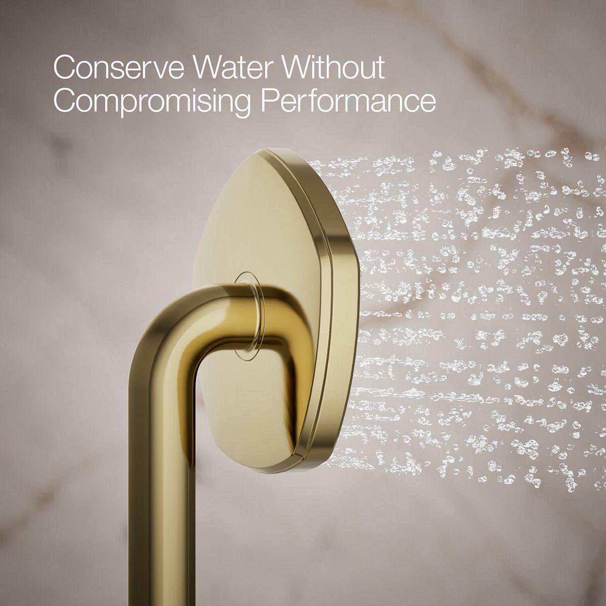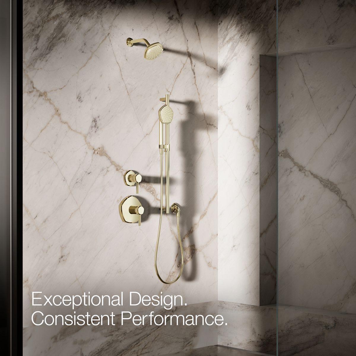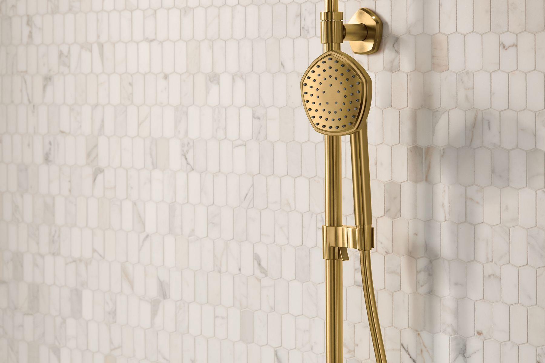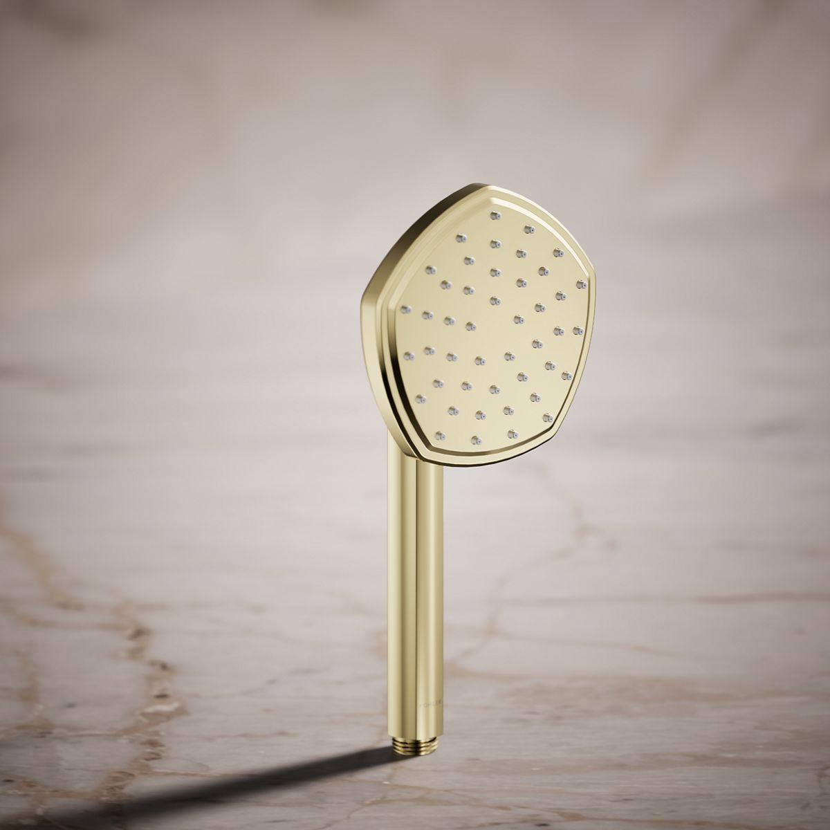Unapologetically luxurious and truly unforgettable, Occasion bathroom faucets and accessories draw inspiration from 1960s Hollywood glamour and extravagance. Fashioned after the era’s sleek dress lines and bold car designs, the Occasion collection reflects graceful elegance with distinctive pentagonal accents, faceted bases, flowing lines, and delicate edges. Blending classic design with modern details, the pentagon-shaped single-function Occasion handshower features 45 nozzles and a Full Coverage with Katalyst spray experience for a shower as indulgent as it is fashionable—all while conserving water. Pair with coordinating handshower holder, showerhead, and other accessories to create your signature bathroom design.