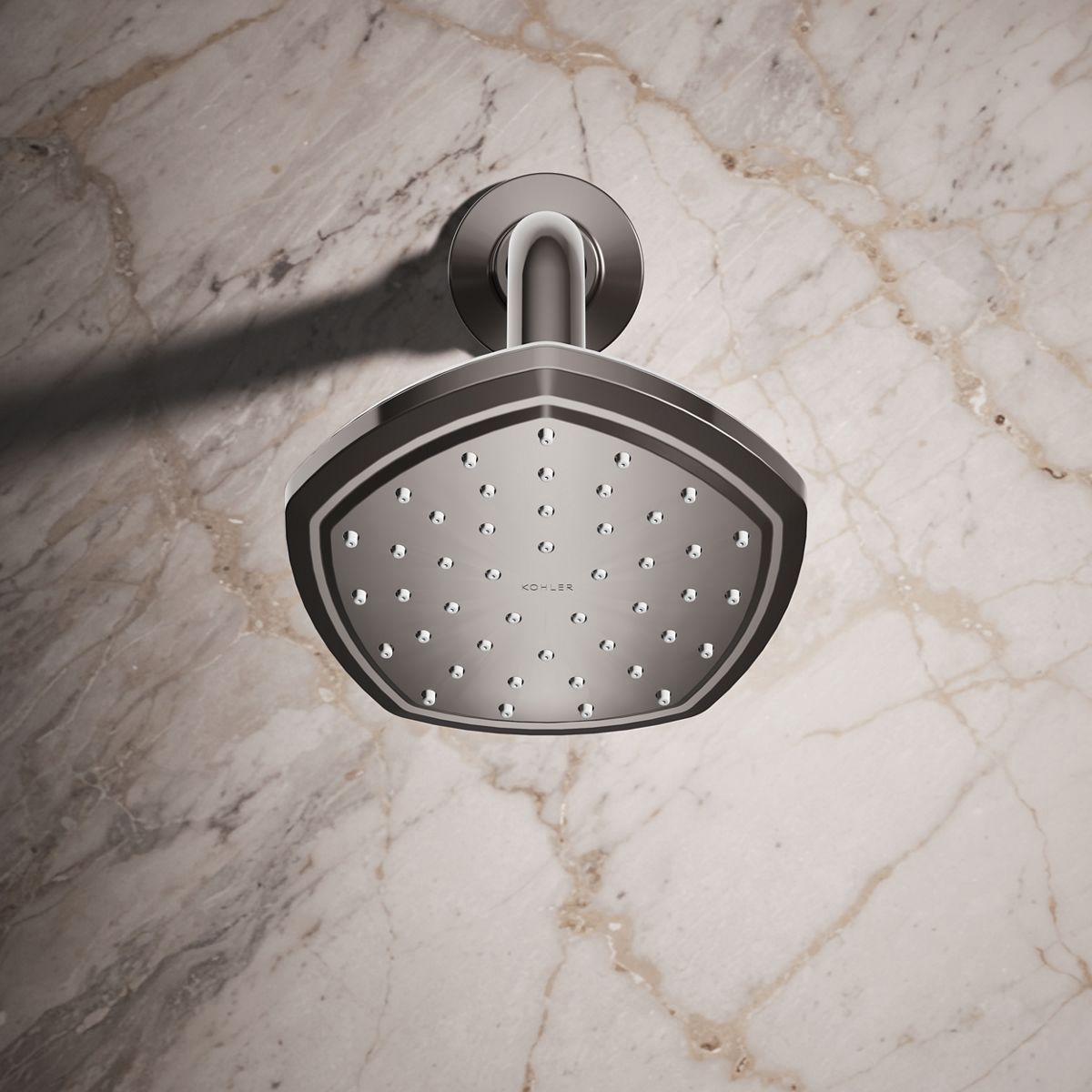 Unapologetically luxurious and truly unforgettable, Occasion bathroom faucets and accessories draw inspiration from 1960s Hollywood glamour and extravagance. Fashioned after the era’s sleek dress lines and bold car designs, the Occasion collection reflects graceful elegance with distinctive pentagonal accents, faceted bases, flowing lines, and delicate edges. Blending classic design with modern details, the 5 pentagon-shaped single-function Occasion 1.75 gpm showerhead features 45 nozzles and a Full Coverage with Katalyst spray experience for a shower as indulgent as it is fashionable--all while conserving water. Pair with coordinating shower arm, valve trim, and other accessories to create your own signature bathroom design.