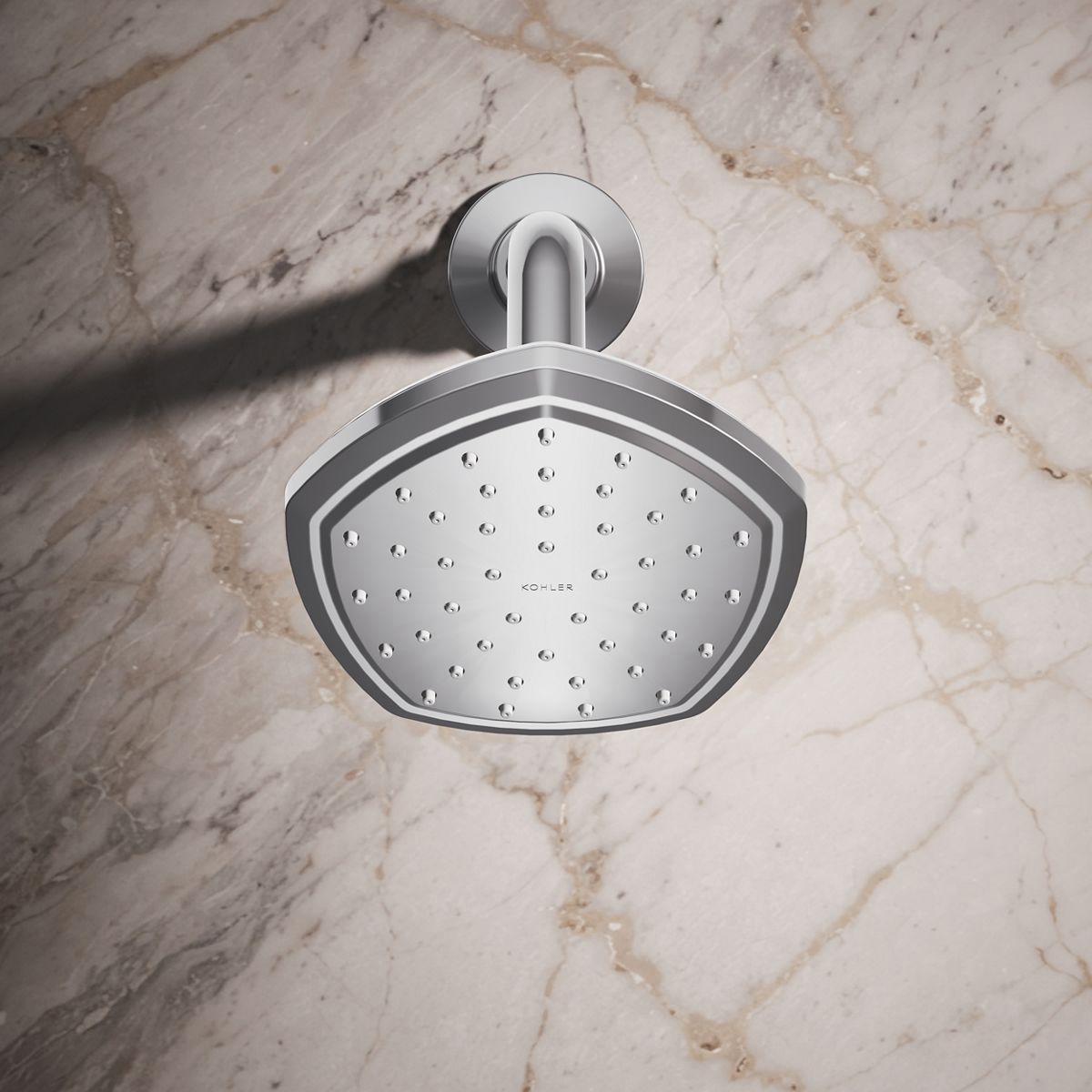 Unapologetically luxurious and truly unforgettable, Occasion bathroom faucets and accessories draw inspiration from 1960s Hollywood glamour and extravagance. Fashioned after the era’s sleek dress lines and bold car designs, the Occasion collection reflects graceful elegance with distinctive pentagonal accents, faceted bases, flowing lines, and delicate edges. Blending classic design and modern details, the 5 pentagon-shaped single-function Occasion showerhead features 65 nozzles and a Full Coverage with Katalyst spray experience for a shower as indulgent as it is fashionable. Pair with coordinating shower arm, valve trim, and other accessories to create your own signature bathroom design.
