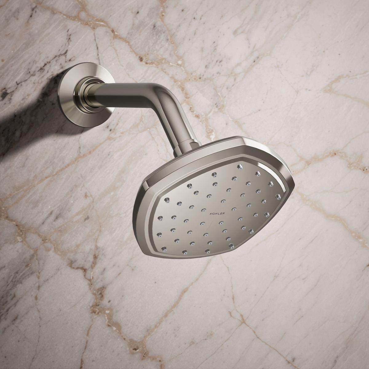 Unapologetically luxurious and truly unforgettable, Occasion bathroom faucets and accessories draw inspiration from 1960s Hollywood glamour and extravagance. Fashioned after the era’s sleek dress lines and bold car designs, the Occasion collection reflects graceful elegance with distinctive pentagonal accents, faceted bases, flowing lines, and delicate edges. Blending classic design and modern details, the 5 pentagon-shaped single-function Occasion showerhead features 65 nozzles and a Full Coverage with Katalyst spray experience for a shower as indulgent as it is fashionable. Pair with coordinating shower arm, valve trim, and other accessories to create your own signature bathroom design.