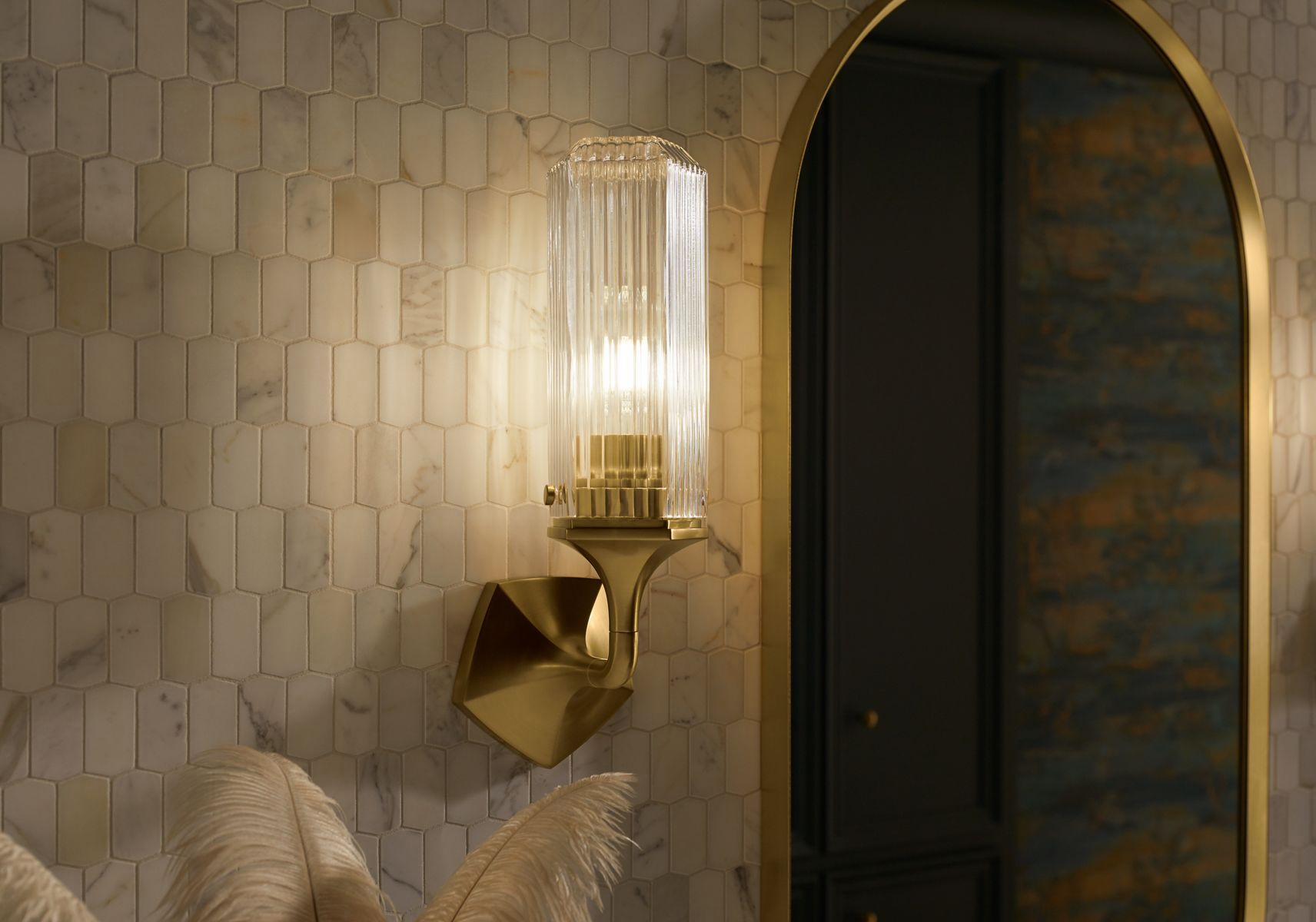 The Occasion lighting collection offers a modern rendition of 1960s Hollywood glamour across sconce, flush-mount, and pendant designs. Faceted metal bases and fluted cylindrical glass shades combine in centerpieces as elegant as they are functional. Like its Golden Age inspiration, the lighting collection evokes a vintage starlet charisma. Alluring and stylish, these statement pieces were created to complement the KOHLER® Occasion faucet collection.