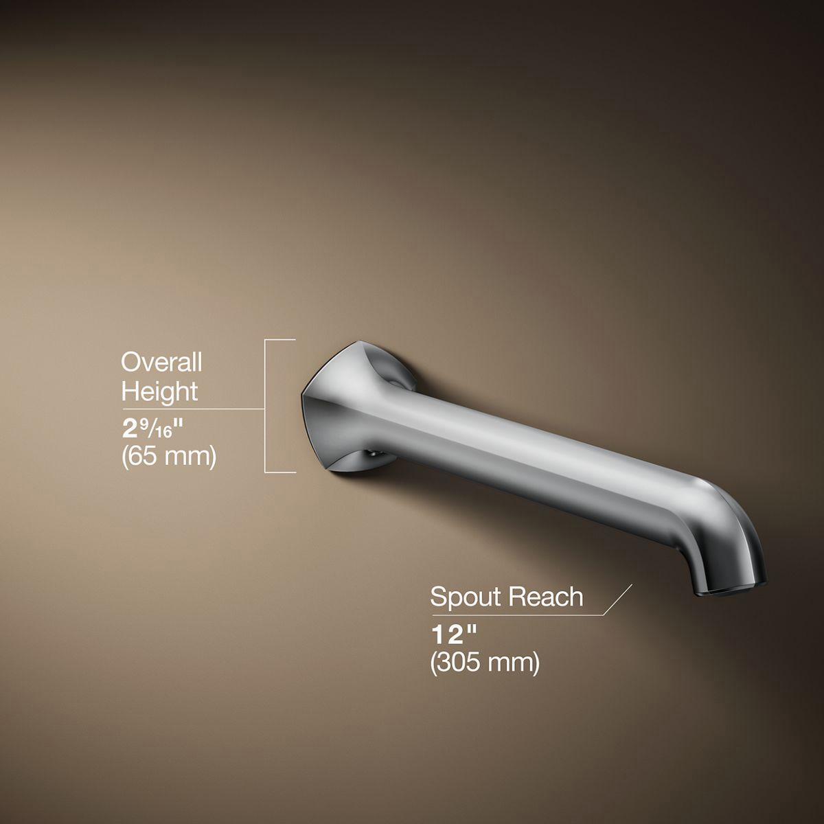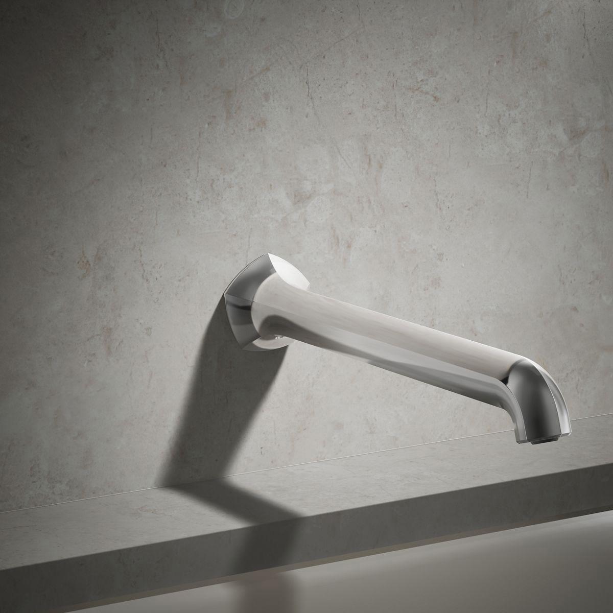 Unapologetically luxurious and truly unforgettable, Occasion bathroom faucets and accessories draw inspiration from 1960s Hollywood glamour and extravagance. Fashioned after the era’s sleek dress lines and bold car designs, the Occasion collection reflects graceful elegance, blending classic midcentury and modern design. Customize your bath with the collection’s distinctive pentagonal accents, faceted bases, flowing lines, and delicate edges. Choose a spout, handles, and finish to build your own signature design. Minimalist with soft square angles, the Occasion wall-mount 12" bath spout with Straight design pairs with your choice of Occasion wall-mount bath faucet handles for a look as fashionable as it is functional.