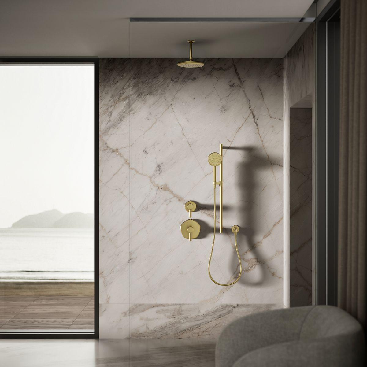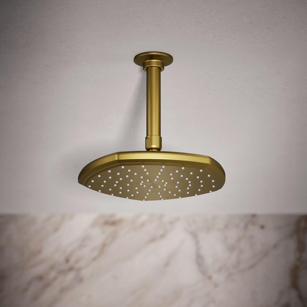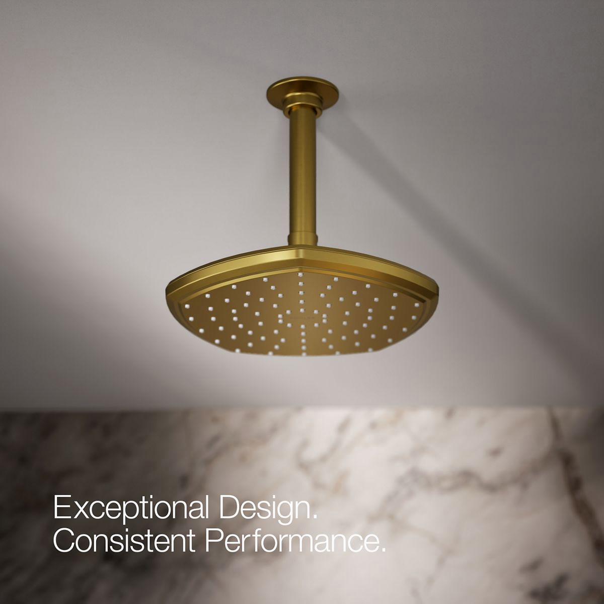Unapologetically luxurious and truly unforgettable, Occasion bathroom faucets and accessories draw inspiration from 1960s Hollywood glamour and extravagance. Fashioned after the era’s sleek dress lines and bold car designs, the Occasion collection reflects graceful elegance with distinctive pentagonal accents, faceted bases, flowing lines, and delicate edges. Blending classic design with modern details, the 8 pentagon-shaped single-function Occasion rainhead features a Full Coverage with Katalyst spray experience for a shower as indulgent as it is fashionable. Choose your coordinating rainhead arm, valve trim, and accessories to create your signature bathroom design.