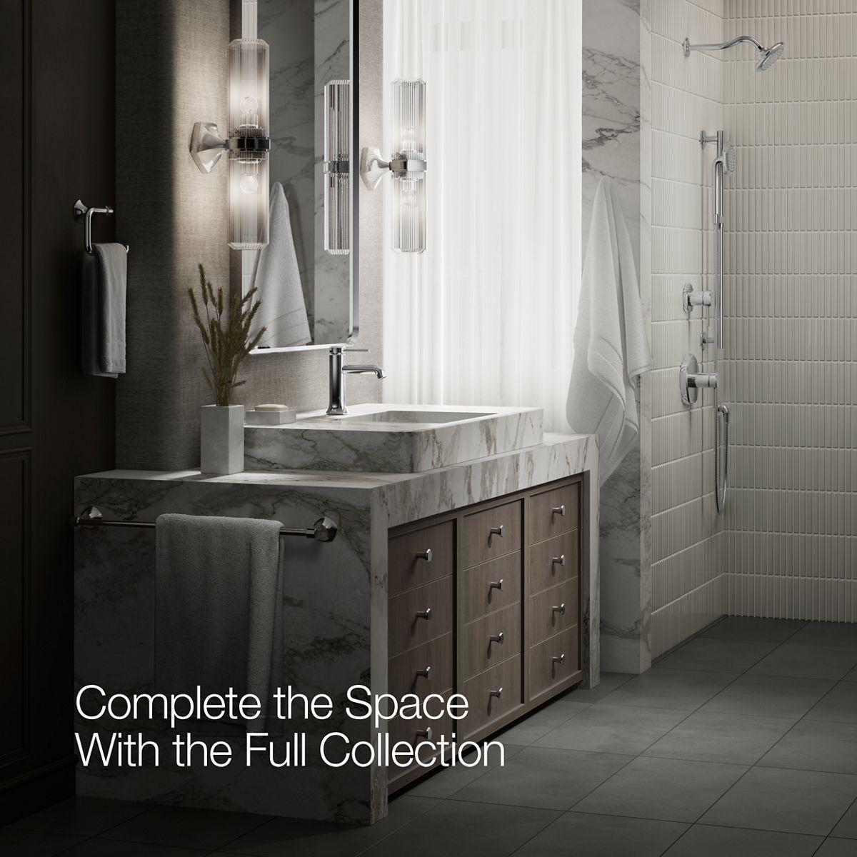 Unapologetically luxurious and truly unforgettable, Occasion bathroom faucets and accessories draw inspiration from 1960s Hollywood glamour and extravagance. Fashioned after the era’s sleek dress lines and bold car designs, the Occasion collection reflects graceful elegance, blending classic midcentury and modern design. Customize your bath with the collection’s distinctive pentagonal accents, faceted bases, flowing lines, and delicate edges. The 0.5 gpm single-handle sink faucet adds sleek style and function to your bathroom—all while conserving water.