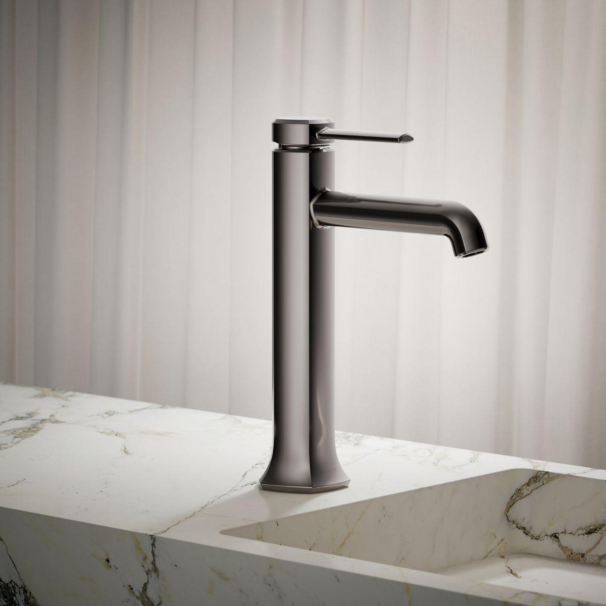 Unapologetically luxurious and truly unforgettable, Occasion bathroom faucets and accessories draw inspiration from 1960s Hollywood glamour and extravagance. Fashioned after the era’s sleek dress lines and bold car designs, the Occasion collection reflects graceful elegance, blending classic midcentury and modern design. Customize your bath with the collection’s distinctive pentagonal accents, faceted bases, flowing lines, and delicate edges. The tall single-handle sink faucet adds sleek style and function to your bathroom—in finishes designed to coordinate with the entire room.