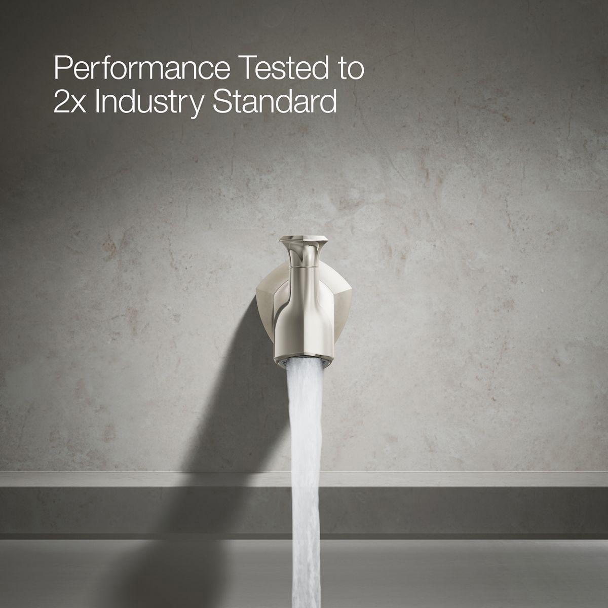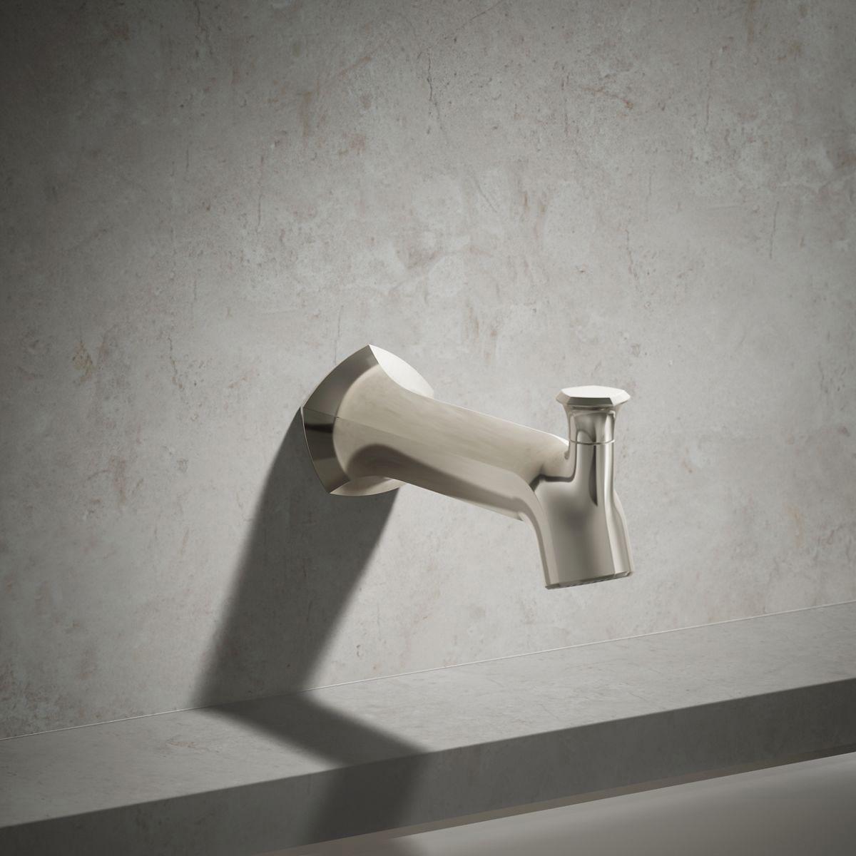 Unapologetically luxurious and truly unforgettable, Occasion bathroom faucets and accessories draw inspiration from 1960s Hollywood glamour and extravagance. Fashioned after the era’s sleek dress lines and bold car designs, the Occasion collection reflects graceful elegance, blending classic midcentury and modern design. Customize your bath with the collection’s distinctive pentagonal accents, faceted bases, flowing lines, and delicate edges. Choose a spout, handles, and finish to build your own signature design. Minimalist with soft square angles, the Occasion wall-mount diverter bath spout with Straight design pairs with your choice of Occasion wall-mount bath faucet handles for a look as fashionable as it is functional.