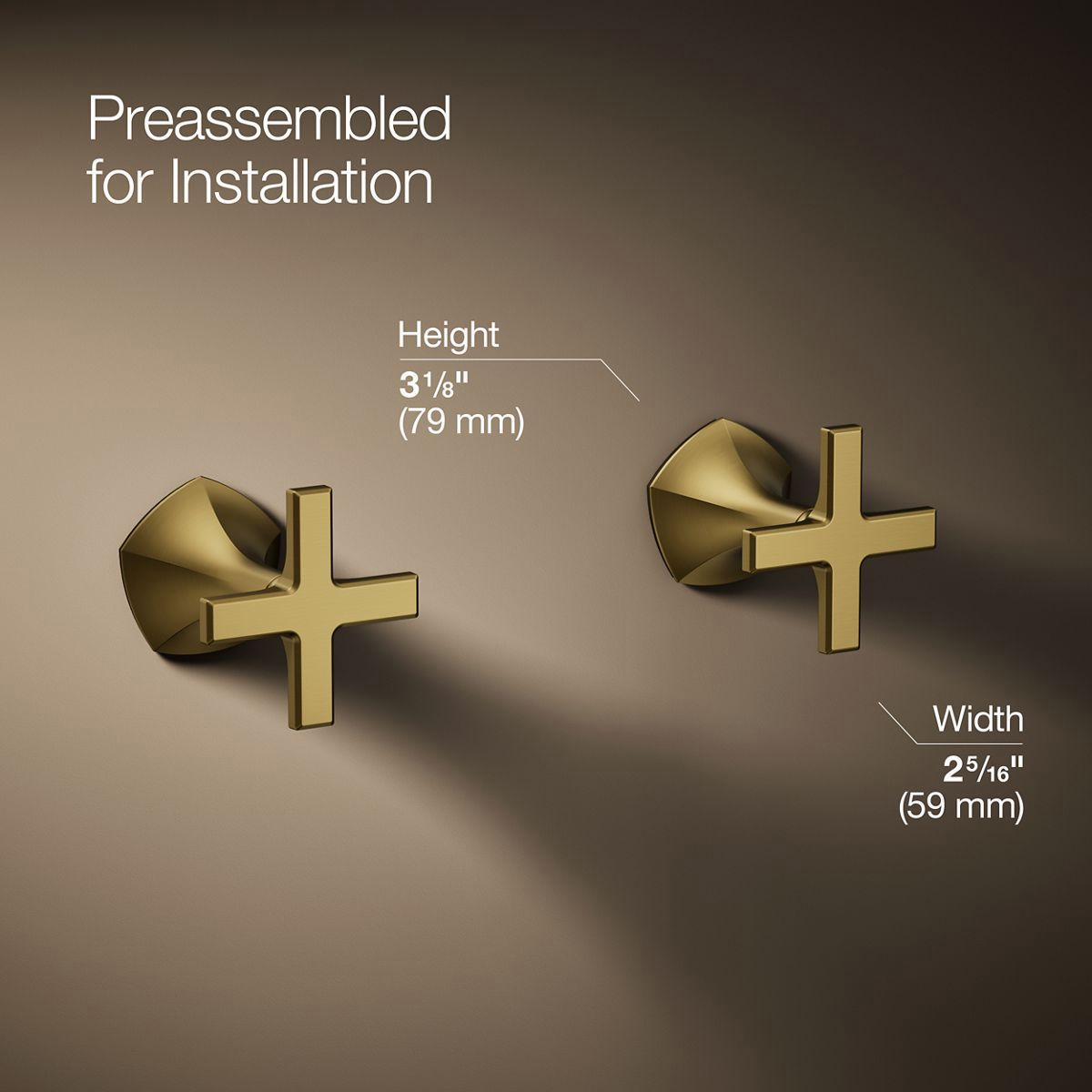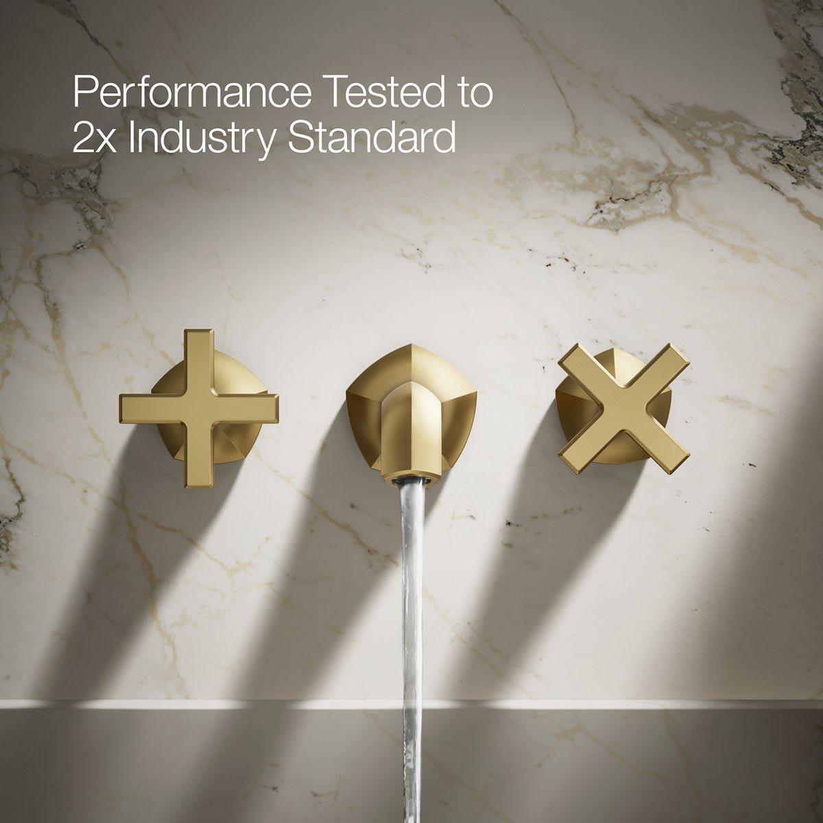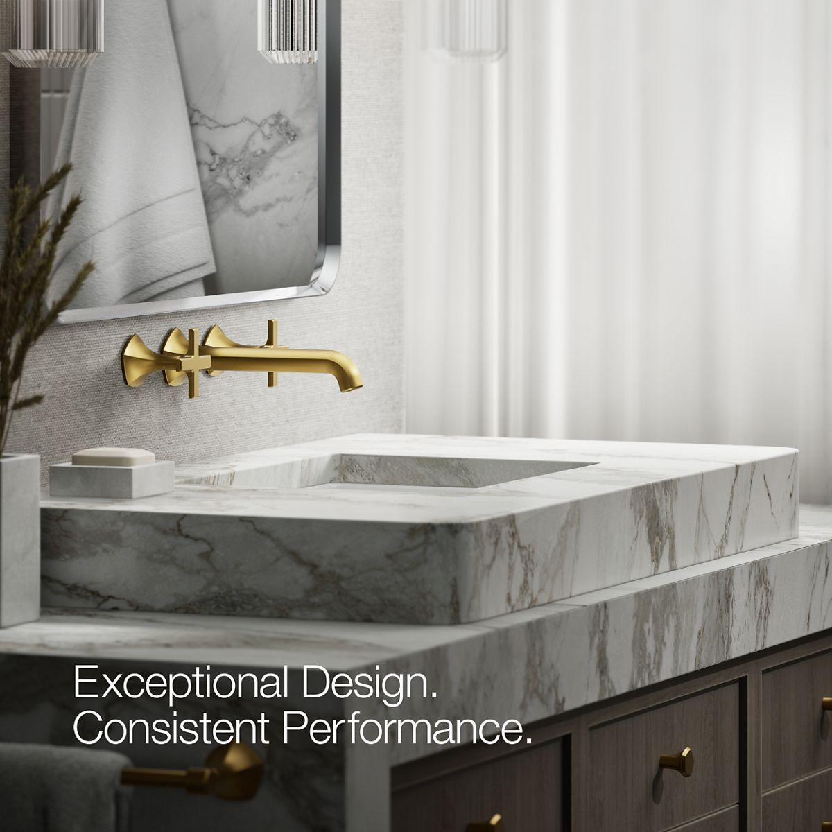 Unapologetically luxurious and truly unforgettable, Occasion bathroom faucets and accessories draw inspiration from 1960s Hollywood glamour and extravagance. Fashioned after the era’s sleek dress lines and bold car designs, the Occasion collection reflects graceful elegance, blending classic midcentury and modern design. Customize your bath with the collection’s distinctive pentagonal accents, faceted bases, flowing lines, and delicate edges. Choose a spout, handles, and finish to build your own signature design. Pair these elegant, minimalist wall-mount sink faucet cross handles with the Occasion wall-mount bathroom sink faucet spout for a look as fashionable as it is functional. Valve sold separately.