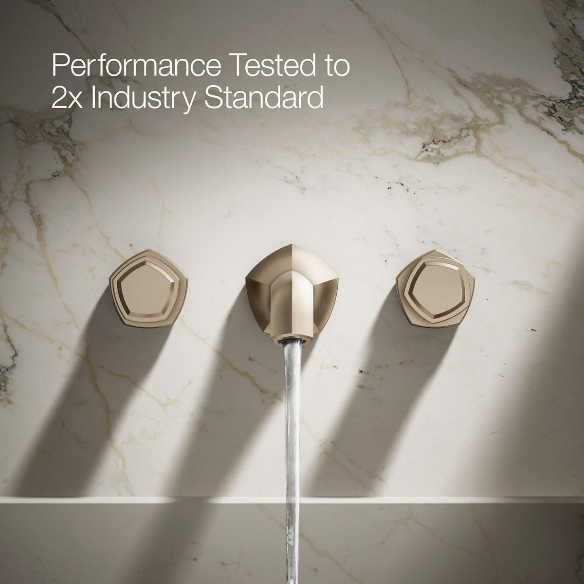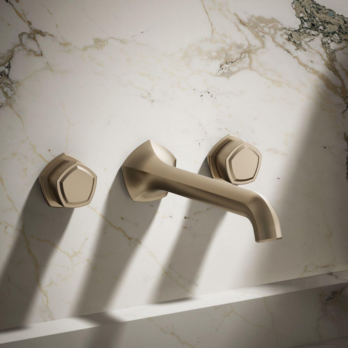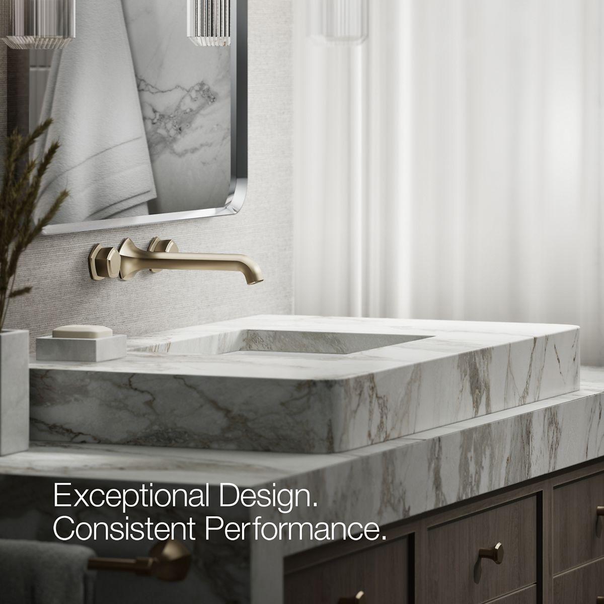 Unapologetically luxurious and truly unforgettable, Occasion bathroom faucets and accessories draw inspiration from 1960s Hollywood glamour and extravagance. Fashioned after the era’s sleek dress lines and bold car designs, the Occasion collection reflects graceful elegance, blending classic midcentury and modern design. Customize your bath with the collection’s distinctive pentagonal accents, faceted bases, flowing lines, and delicate edges. Choose a spout, handles, and finish to build your own signature design. Pair these elegant, minimalist wall-mount sink faucet knob handles with the Occasion wall-mount bathroom sink faucet spout for a look as fashionable as it is functional. Valve sold separately.