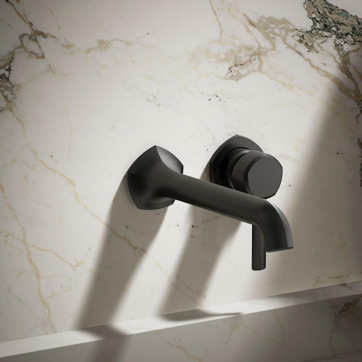 Unapologetically luxurious and truly unforgettable, Occasion bathroom faucets and accessories draw inspiration from 1960s Hollywood glamour and extravagance. Fashioned after the era’s sleek dress lines and bold car designs, the Occasion collection reflects graceful elegance, blending classic midcentury and modern design. Customize your bath with the collection’s distinctive pentagonal accents, faceted bases, flowing lines, and delicate edges. Choose a spout, handles, and finish to build your own signature design. Minimalist with soft square angles, the Occasion wall-mount bathroom sink faucet spout trim with Straight design pairs with your choice of Occasion wall-mount sink faucet handles for a look as fashionable as it is functional. Drain sold separately.