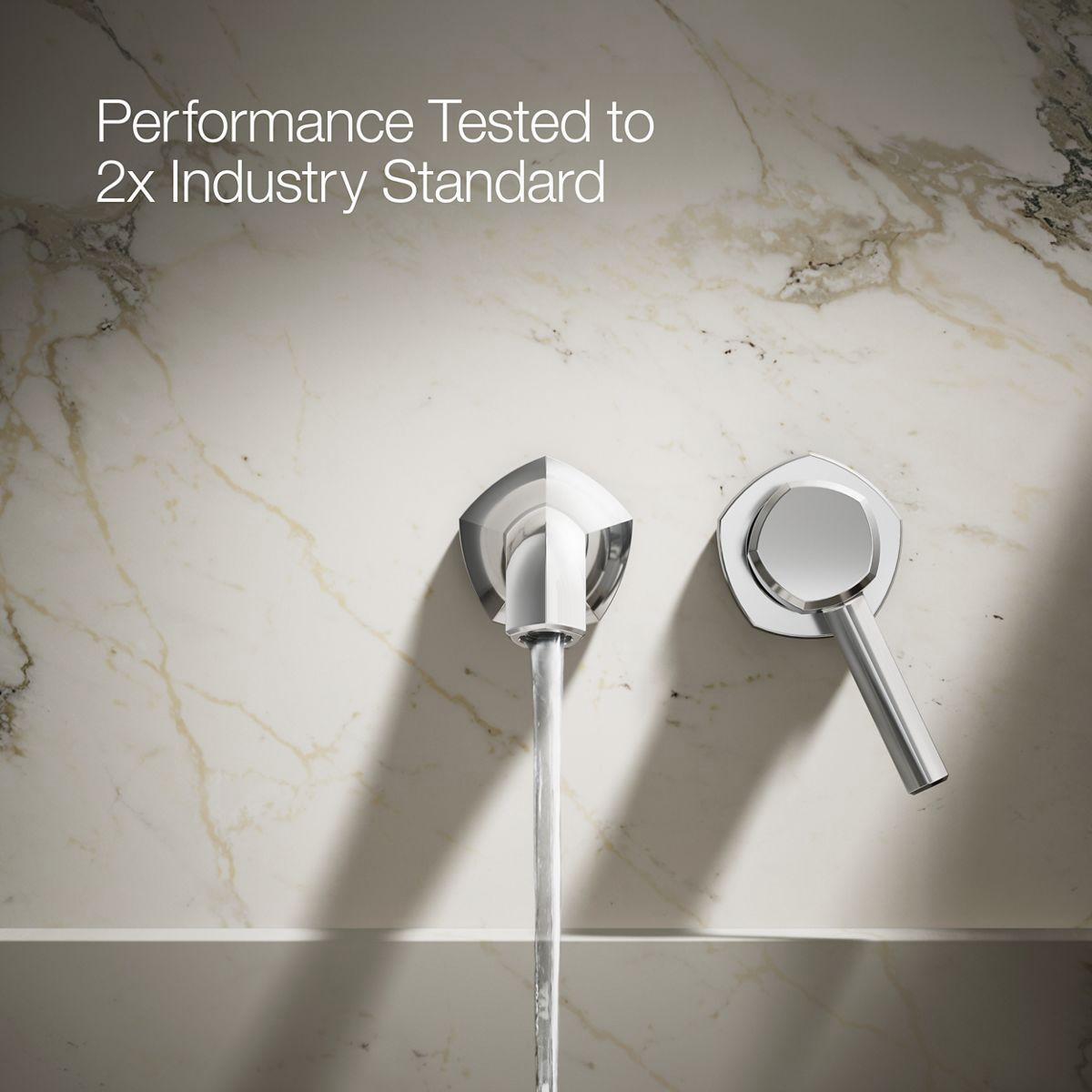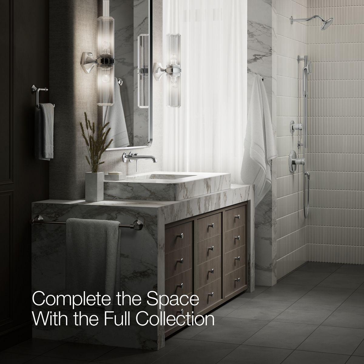 Unapologetically luxurious and truly unforgettable, Occasion bathroom faucets and accessories draw inspiration from 1960s Hollywood glamour and extravagance. Fashioned after the era’s sleek dress lines and bold car designs, the Occasion collection reflects graceful elegance, blending classic midcentury and modern design. Customize your bath with the collection’s distinctive pentagonal accents, faceted bases, flowing lines, and delicate edges. Choose a spout, handles, and finish to build your own signature design. Minimalist with soft square angles, the Occasion wall-mount bathroom sink faucet spout trim with Straight design pairs with your choice of Occasion wall-mount sink faucet handles for a look as fashionable as it is functional. Drain sold separately.