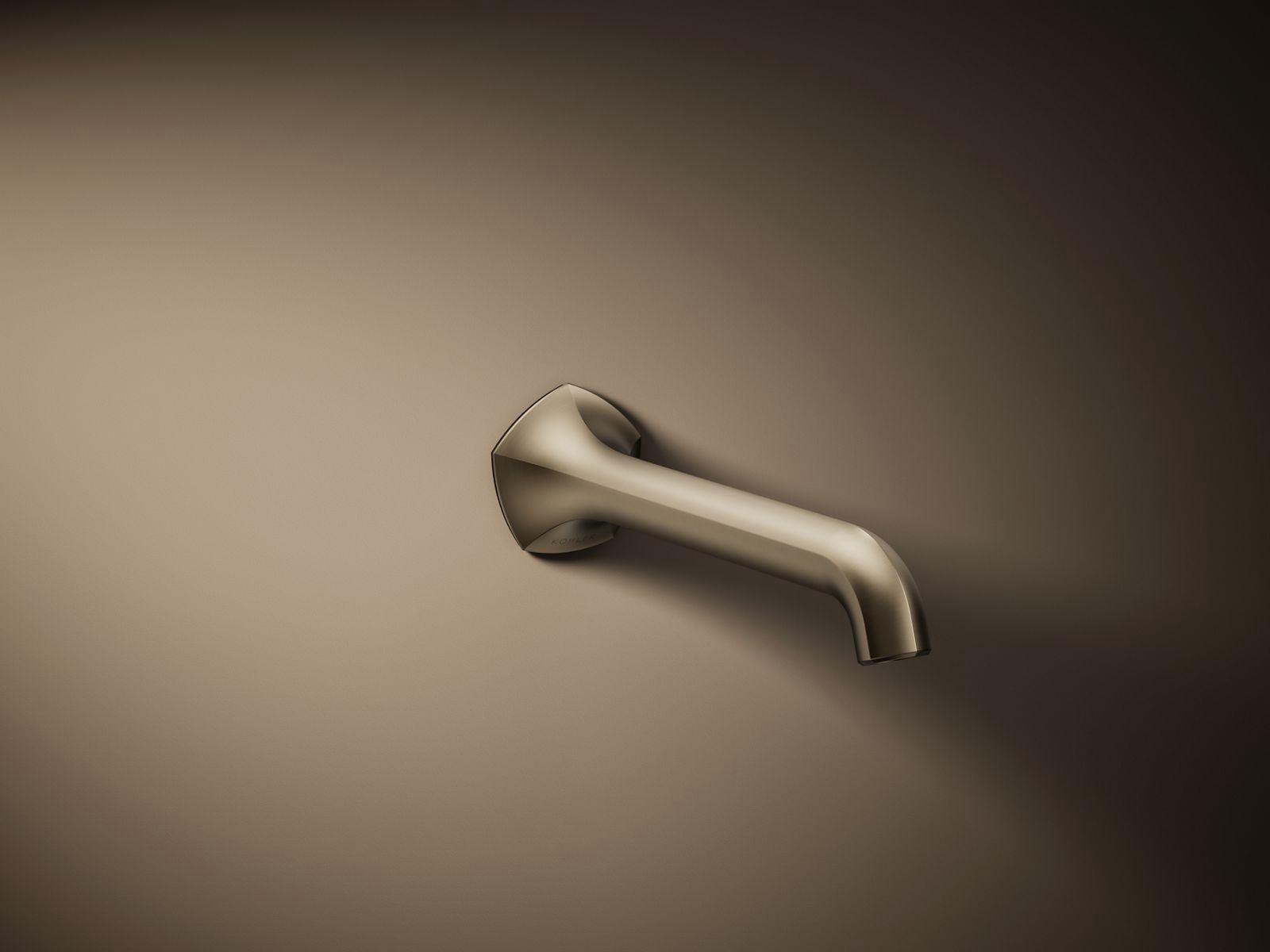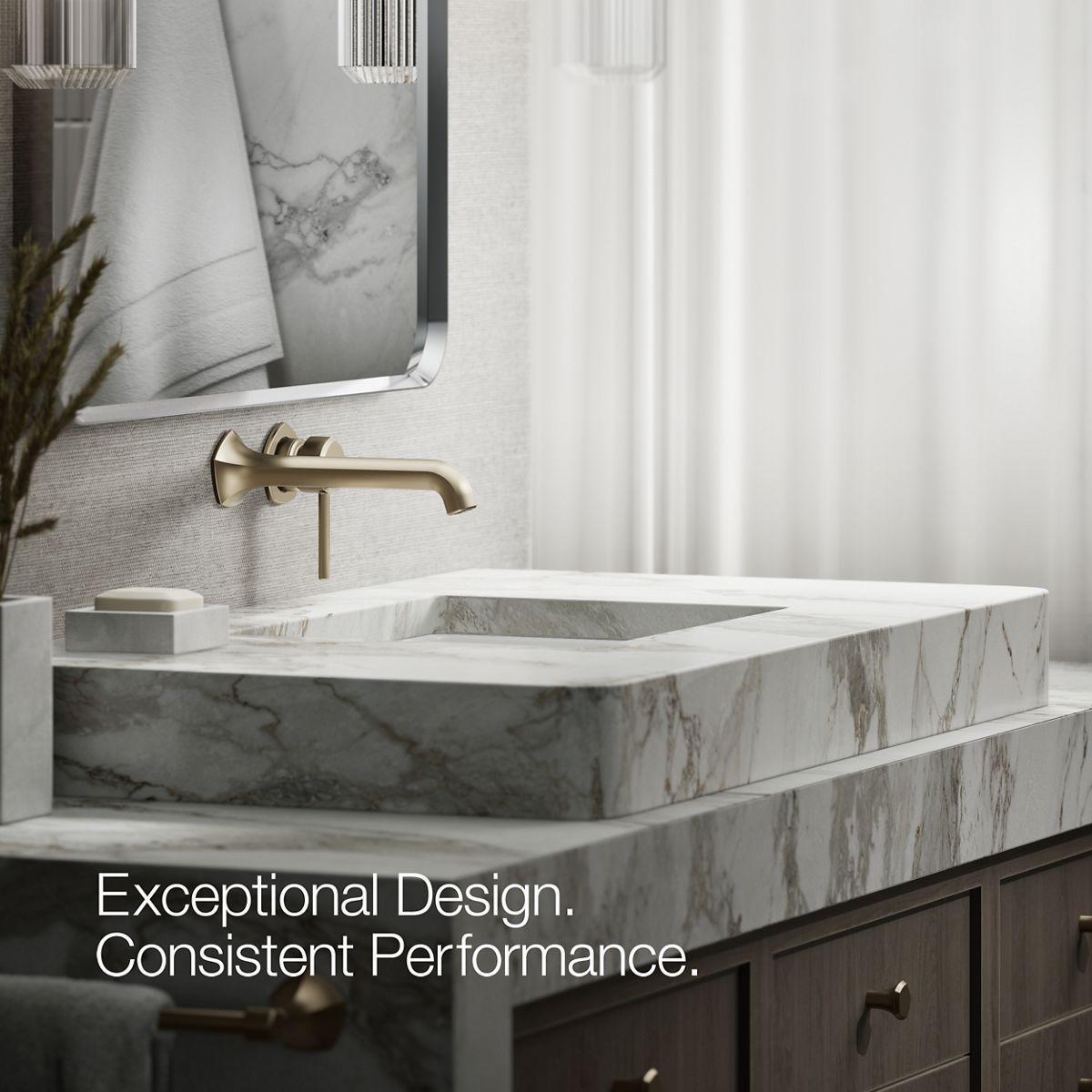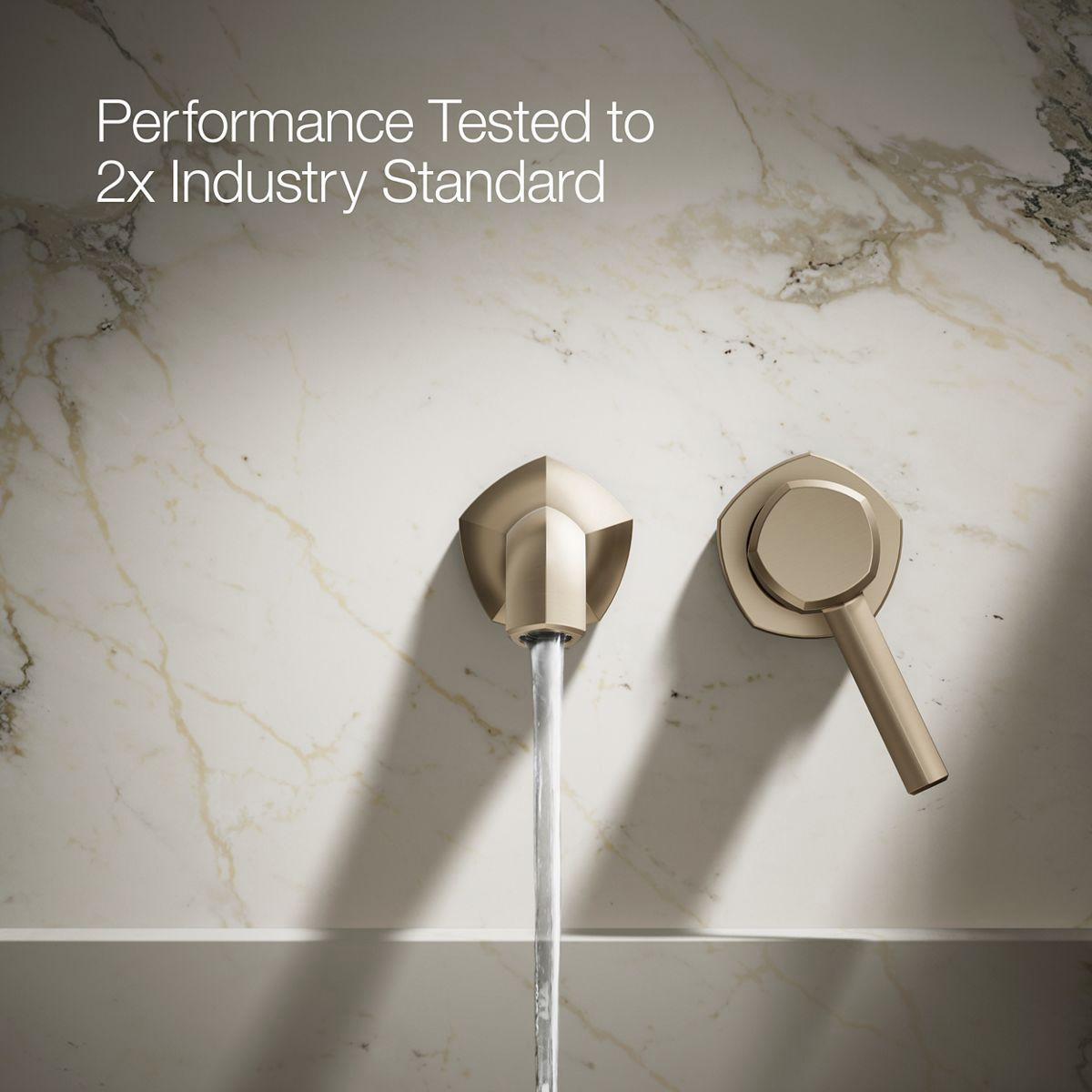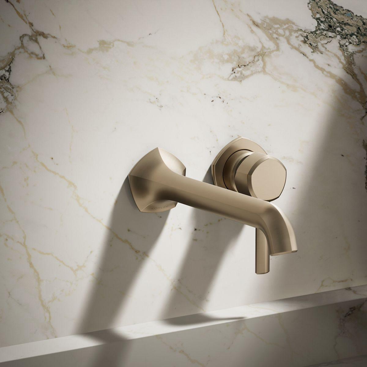 Unapologetically luxurious and truly unforgettable, Occasion bathroom faucets and accessories draw inspiration from 1960s Hollywood glamour and extravagance. Fashioned after the era’s sleek dress lines and bold car designs, the Occasion collection reflects graceful elegance, blending classic midcentury and modern design. Customize your bath with the collection’s distinctive pentagonal accents, faceted bases, flowing lines, and delicate edges. Choose a spout, handles, and finish to build your own signature design. Minimalist with soft square angles, the Occasion wall-mount bathroom sink faucet spout trim with Straight design pairs with your choice of Occasion wall-mount sink faucet handles for a look as fashionable as it is functional. Drain sold separately.