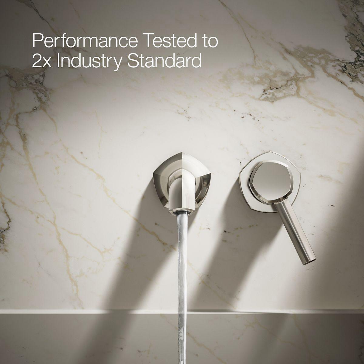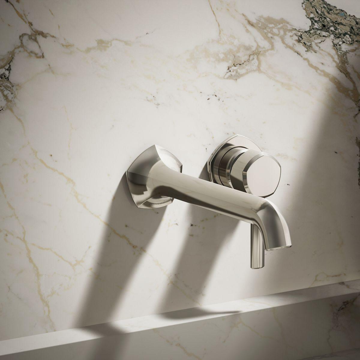 Unapologetically luxurious and truly unforgettable, Occasion bathroom faucets and accessories draw inspiration from 1960s Hollywood glamour and extravagance. Fashioned after the era’s sleek dress lines and bold car designs, the Occasion collection reflects graceful elegance, blending classic midcentury and modern design. Customize your bath with the collection’s distinctive pentagonal accents, faceted bases, flowing lines, and delicate edges. Choose a spout, handles, and finish to build your own signature design. Minimalist with soft square angles, the Occasion wall-mount bathroom sink faucet spout trim with Straight design pairs with your choice of Occasion wall-mount sink faucet handles for a look as fashionable as it is functional. Drain sold separately.