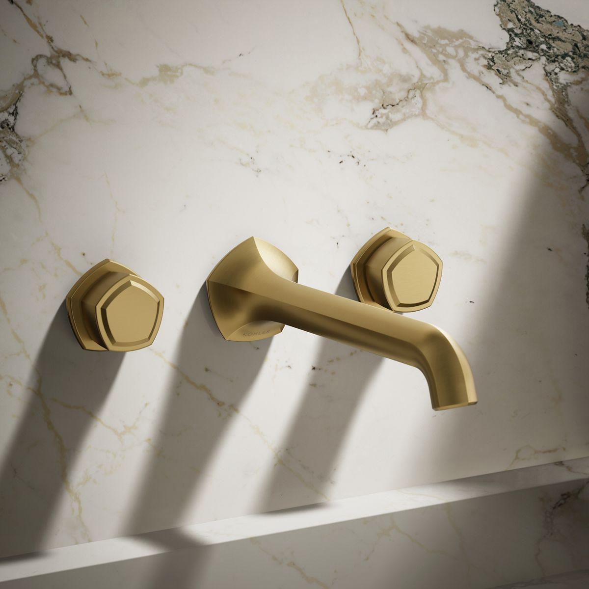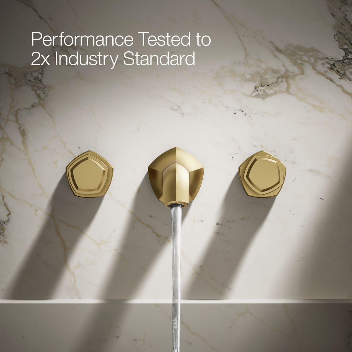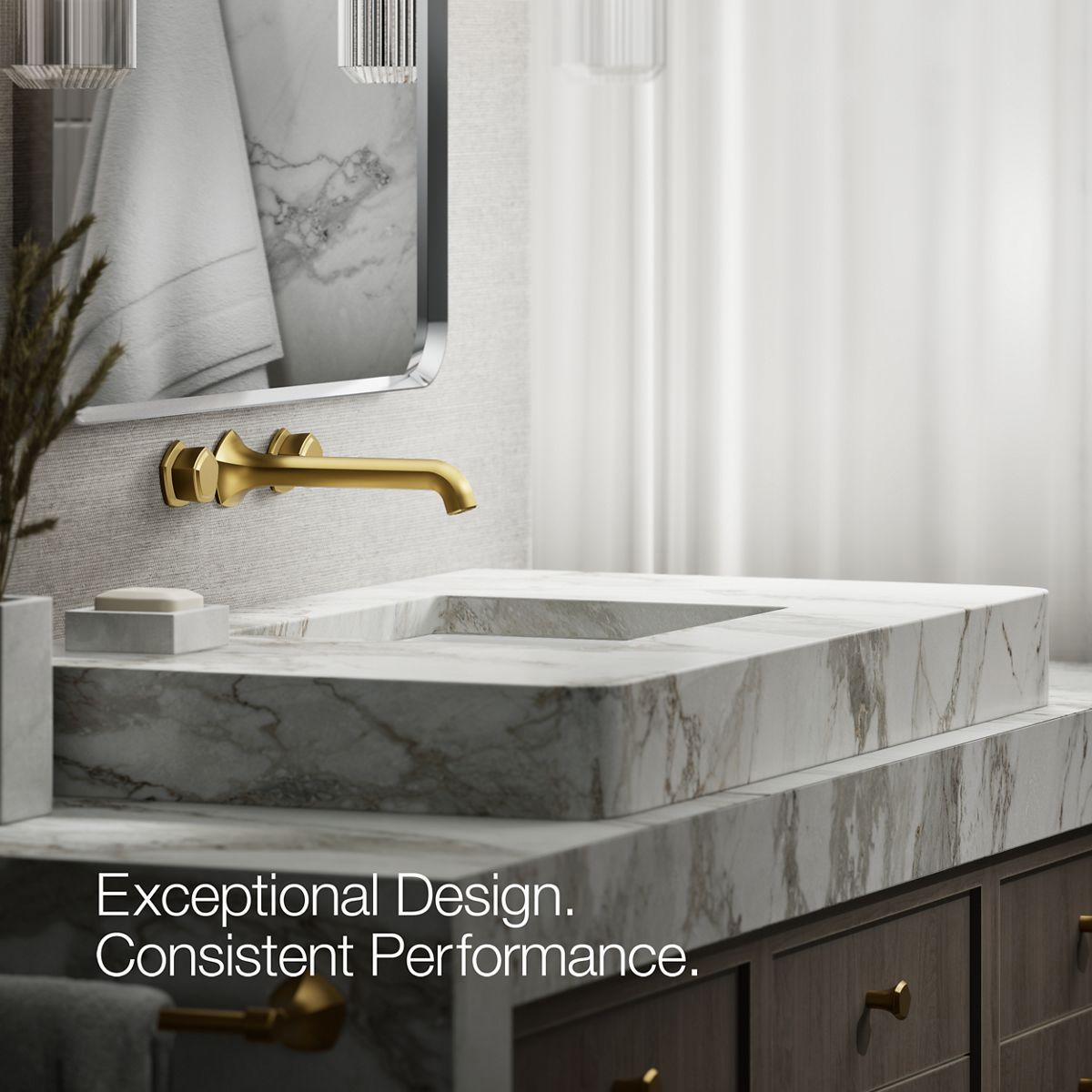 Unapologetically luxurious and truly unforgettable, Occasion bathroom faucets and accessories draw inspiration from 1960s Hollywood glamour and extravagance. Fashioned after the era’s sleek dress lines and bold car designs, the Occasion collection reflects graceful elegance, blending classic midcentury and modern design. Customize your bath with the collection’s distinctive pentagonal accents, faceted bases, flowing lines, and delicate edges. Choose a spout, handles, and finish to build your own signature design. Pair these elegant, minimalist wall-mount sink faucet knob handles with the Occasion wall-mount bathroom sink faucet spout for a look as fashionable as it is functional. Valve sold separately.