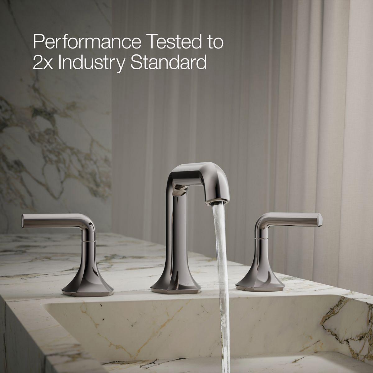 Unapologetically luxurious and truly unforgettable, Occasion bathroom faucets and accessories draw inspiration from 1960s Hollywood glamour and extravagance. Fashioned after the era’s sleek dress lines and bold car designs, the Occasion collection reflects graceful elegance, blending classic midcentury and modern design. Customize your bath with the collection’s distinctive pentagonal accents, faceted bases, flowing lines, and delicate edges. Choose a spout, handles, and finish to build your own signature design. Minimalist with soft square angles, the Occasion bathroom sink faucet spout with Straight design pairs with your choice of Occasion sink faucet handles for a look as fashionable as it is functional—all while conserving water at 0.5 gpm.
