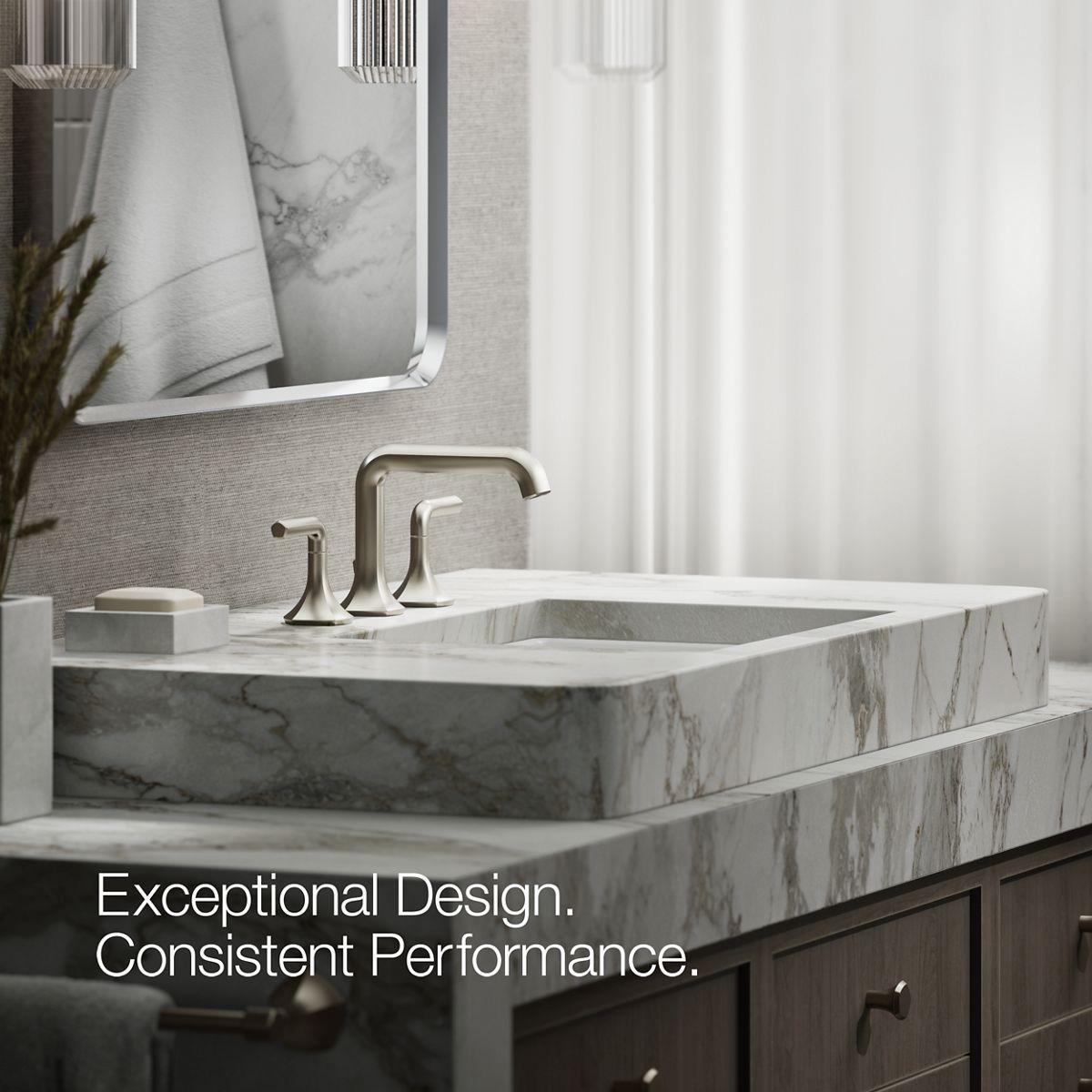 Unapologetically luxurious and truly unforgettable, Occasion bathroom faucets and accessories draw inspiration from 1960s Hollywood glamour and extravagance. Fashioned after the era’s sleek dress lines and bold car designs, the Occasion collection reflects graceful elegance, blending classic midcentury and modern design. Customize your bath with the collection’s distinctive pentagonal accents, faceted bases, flowing lines, and delicate edges. Choose a spout, handles, and finish to build your own signature design. Minimalist with soft square angles, the Occasion bathroom sink faucet spout with Straight design pairs with your choice of Occasion sink faucet handles for a look as fashionable as it is functional.