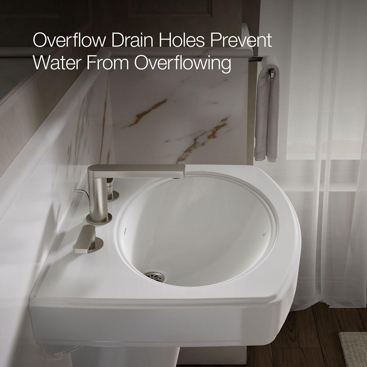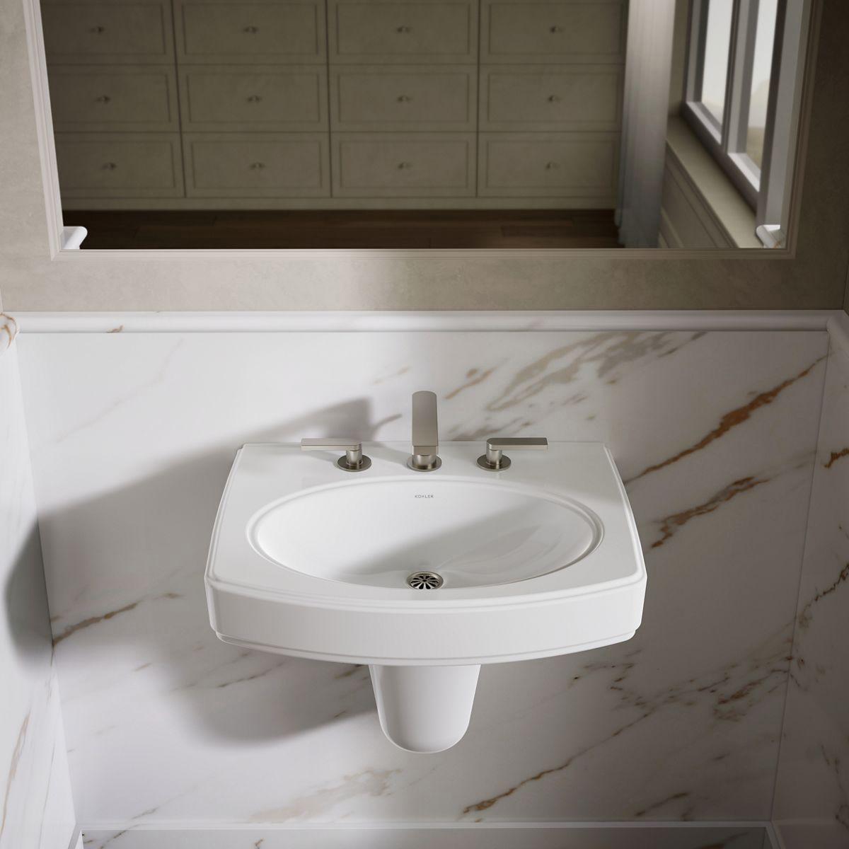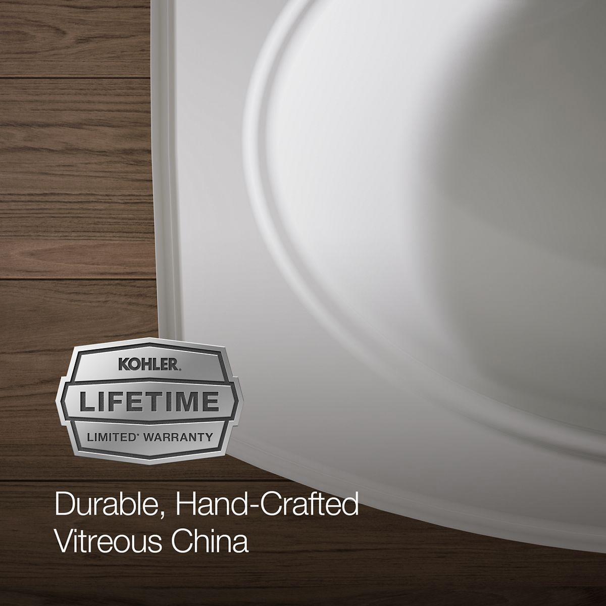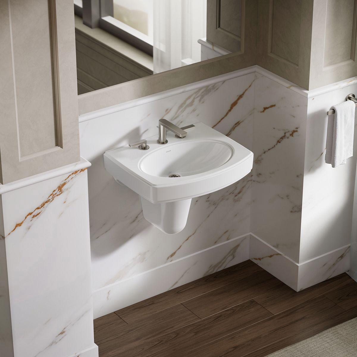 Combining box-band lines and simple, double-ridge edge detailing, Pinoir has a crisp, classic style to flatter both contemporary and modern bathrooms. This sink meets ADA standards when the rim is installed 34 inches from the floor, and its space-saving design works in even the smallest powder rooms.