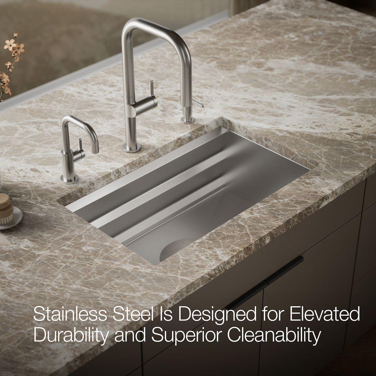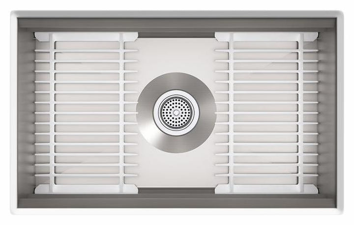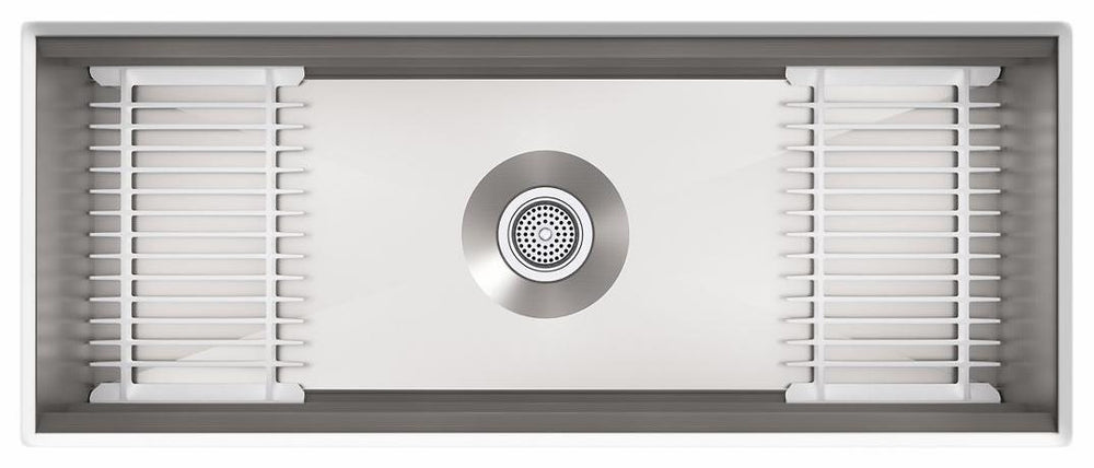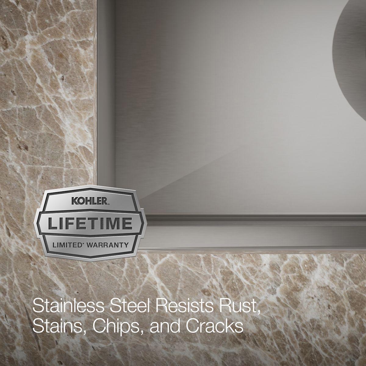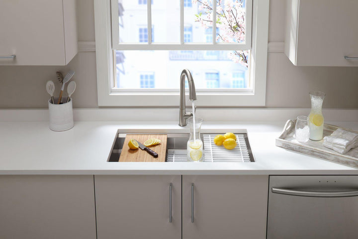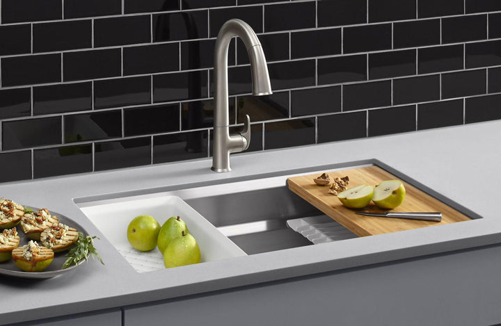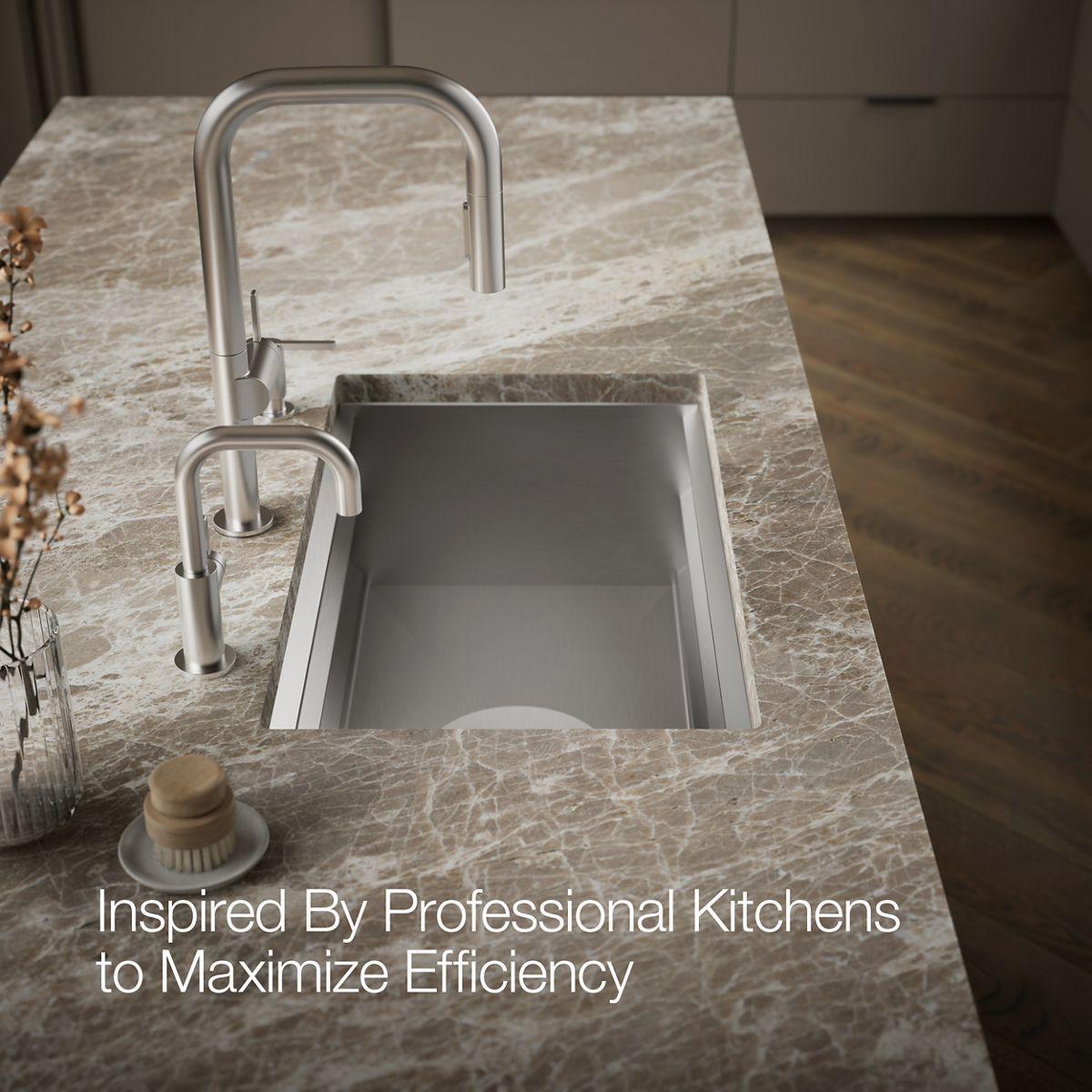 Create a highly functional kitchen workstation with the Prolific sink and its included accessories.This innovative stainless-steel sink features three graduated ledges in the basin, so you can place the bamboo cutting board, multipurpose grated racks (two), colander, and wash bin exactly where you want them for maximum efficiency as you work.The sink comes with all five accessories included. Other features include a unique cone-shaped drain for easier cleanup and SilentShield® sound absorption for less noise.