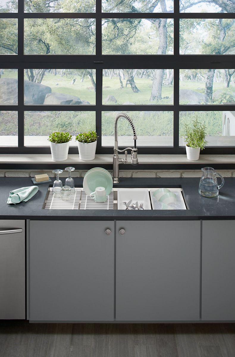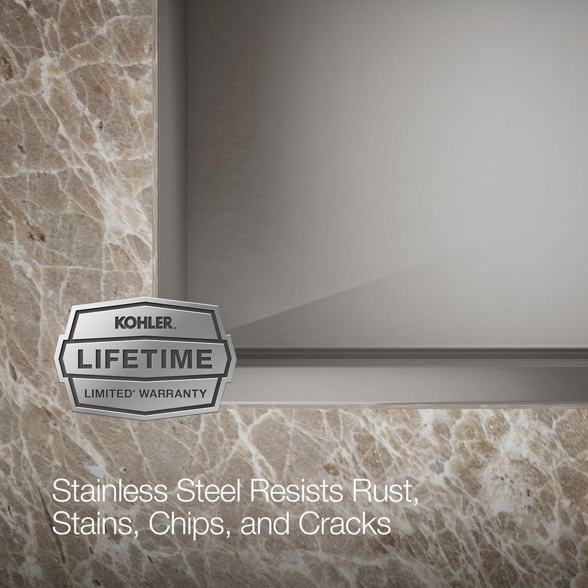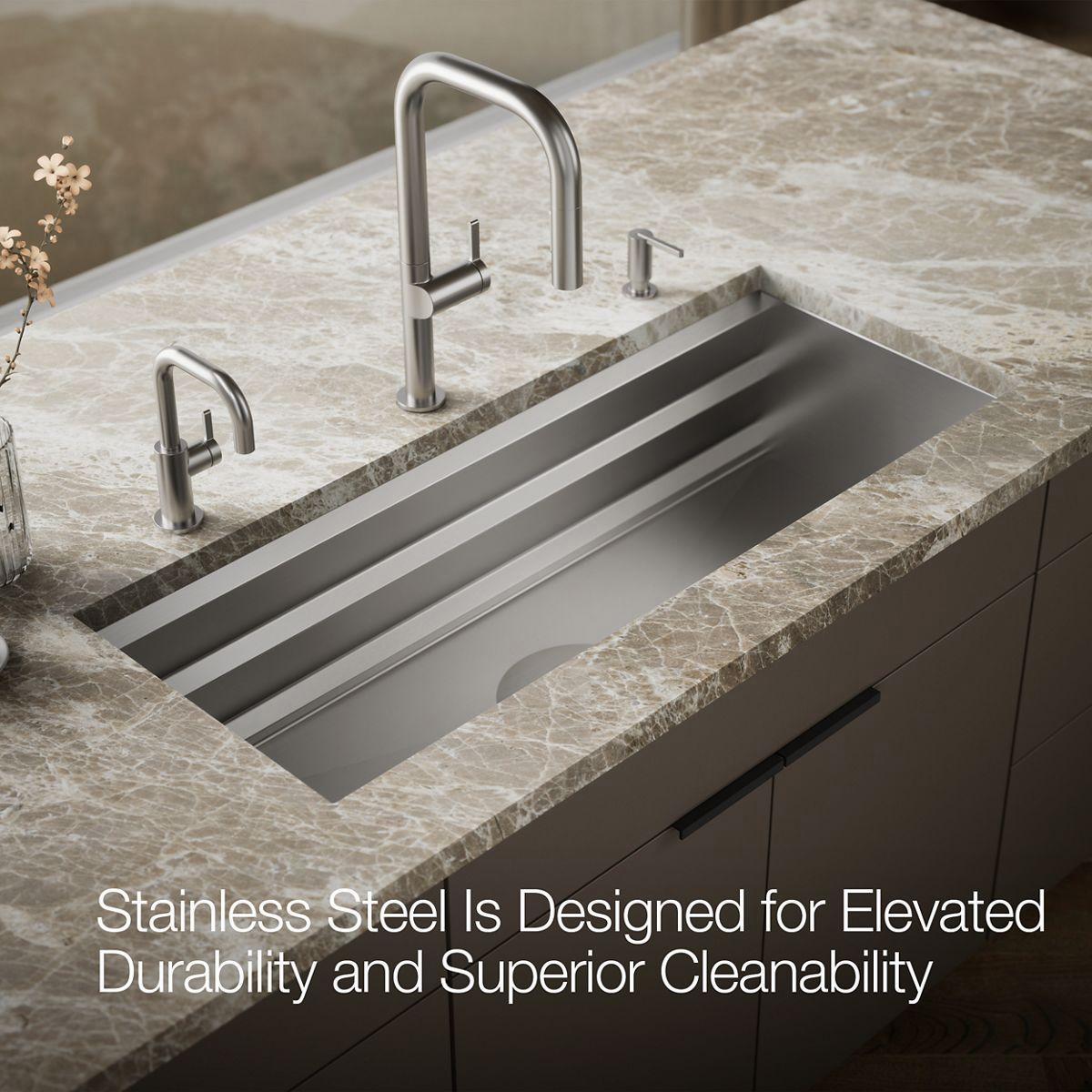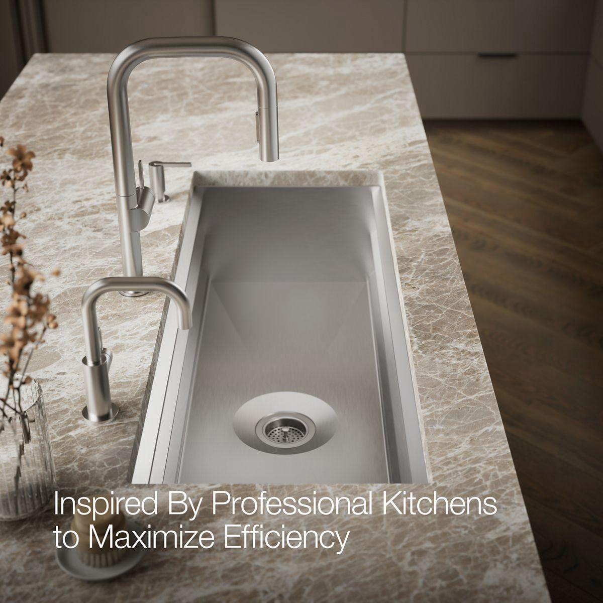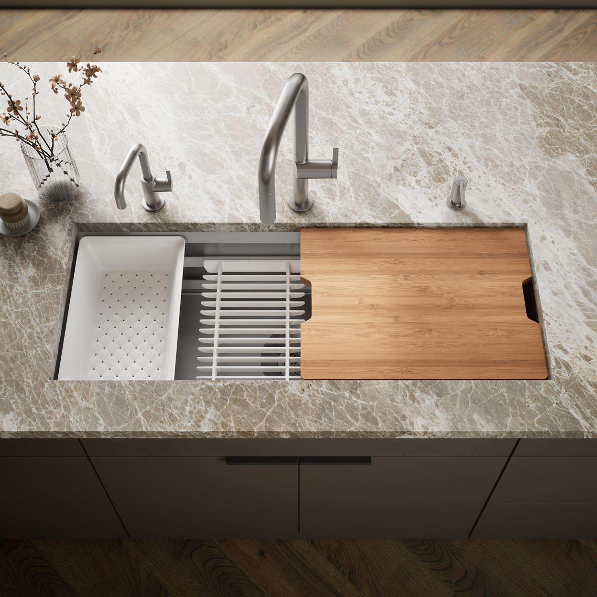 Create a highly functional kitchen workstation with the Prolific sink and its included accessories. This innovative stainless steel sink features three graduated ledges in the bowl, so you can place the bamboo cutting board, two grated racks, colander, and wash bin exactly where you want them for maximum efficiency as you work. The sink comes with all five accessories included. Other features include a unique cone-shaped drain for easier cleanup and SilentShield sound absorption for less noise.