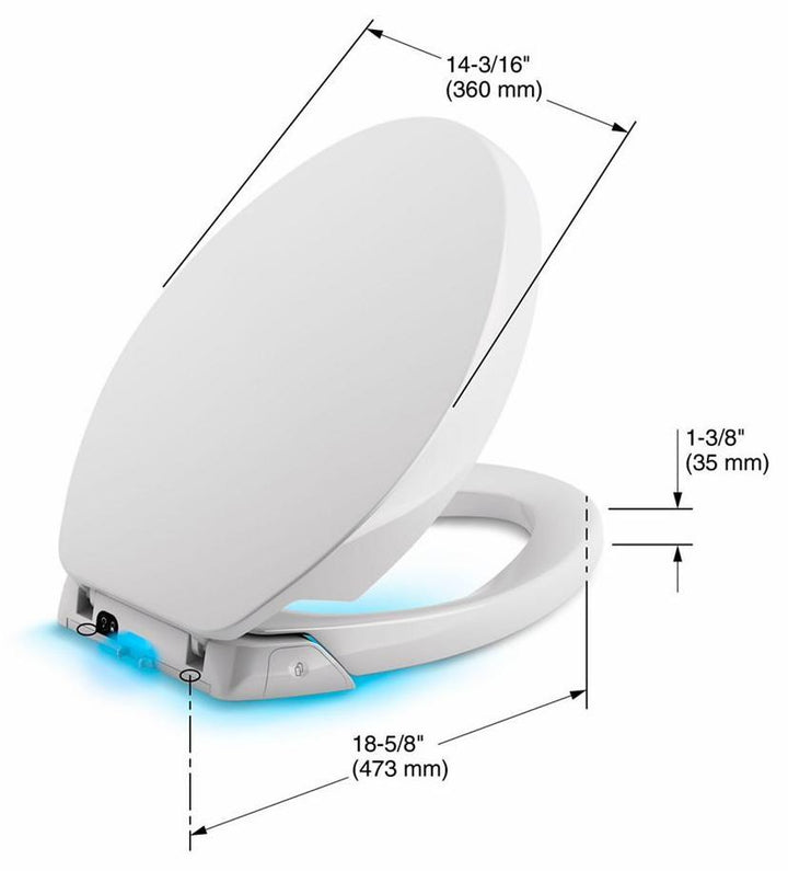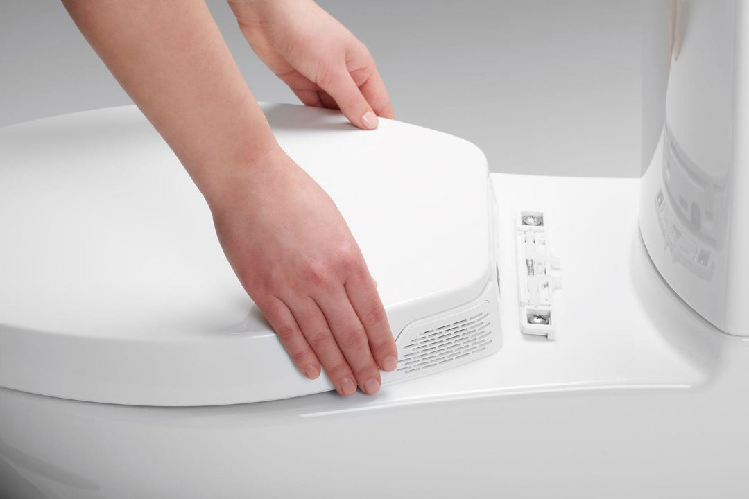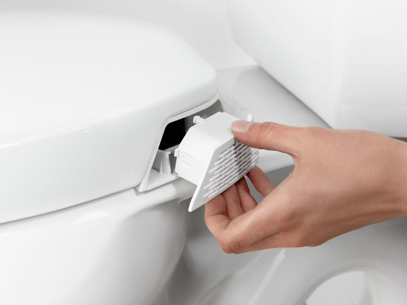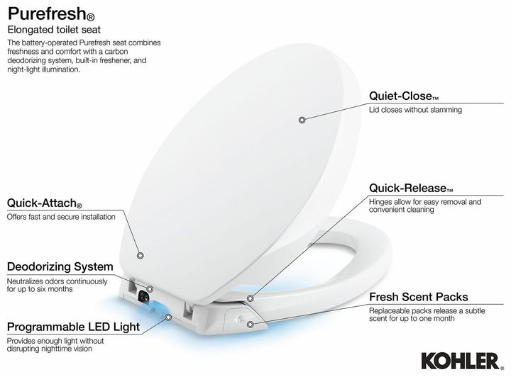 Experience a new level of freshness with this KOHLER Purefresh toilet seat. Purefresh combines a carbon deodorizing system that neutralizes odors and a built-in freshener that releases a light scent. This battery-operated seat also includes Nightlight illumination so you can safely locate your toilet in the dark. Unique Grip-Tight bumpers hold the seat firmly in place and prevent shifting. This slow-close seat features technology that prevents the seat from slamming and simplifies both cleaning and installation.