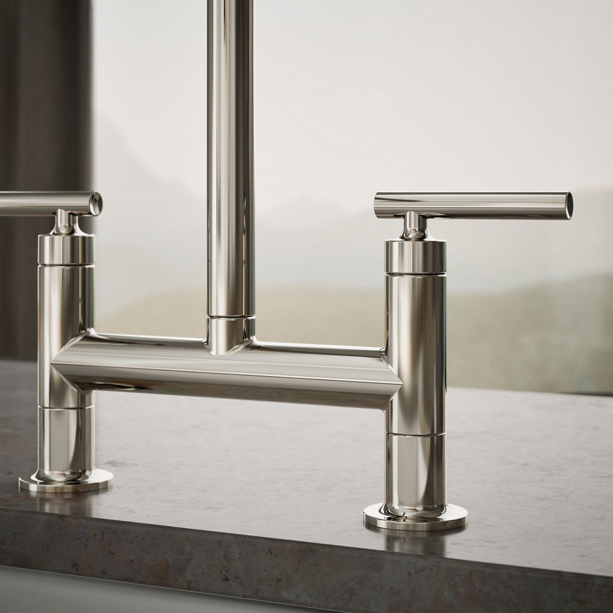 Pairing a classic bridge design with bold new touches, this Purist kitchen faucet combines distinctive modern style and easy-to-use features. The high-arch spout provides 10 inches of clearance and rotates 360 degrees, making way for your largest pots and pans. Extended lever handles offer plenty of grip area.