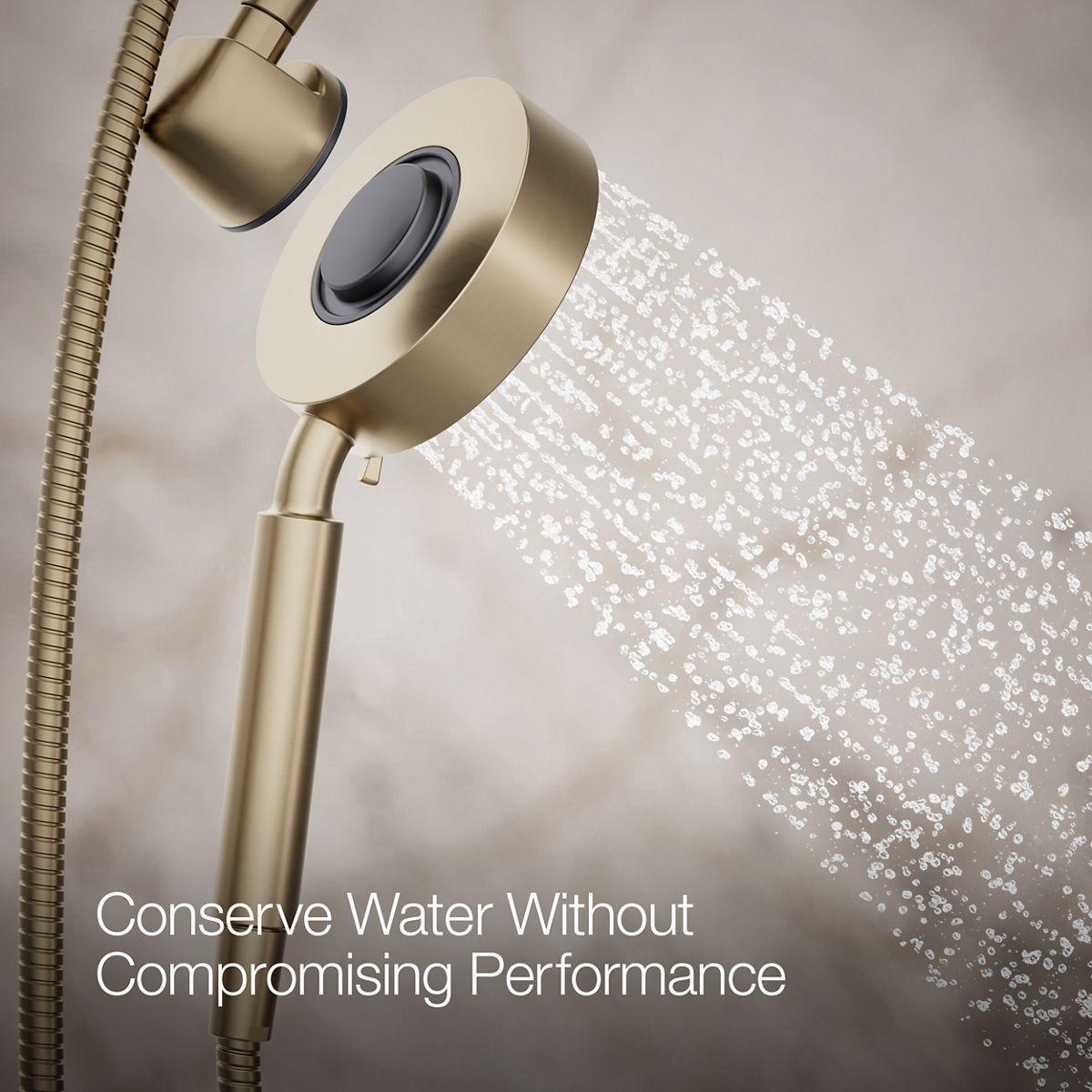 - Multifunction showerhead and handshower each have advanced spray engines to provide three experiences: full coverage, pulsating massage, and silk spray.
