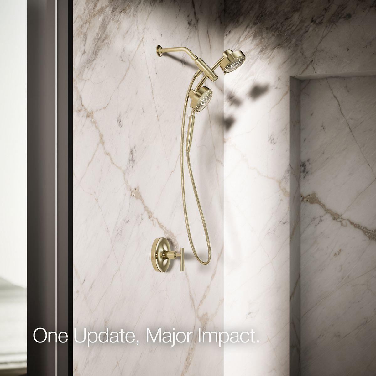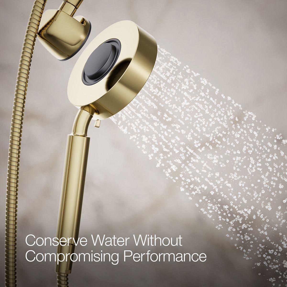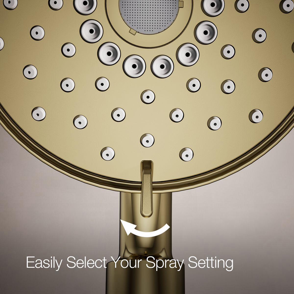 - Multifunction showerhead and handshower each have advanced spray engines to provide three experiences: full coverage, pulsating massage, and silk spray