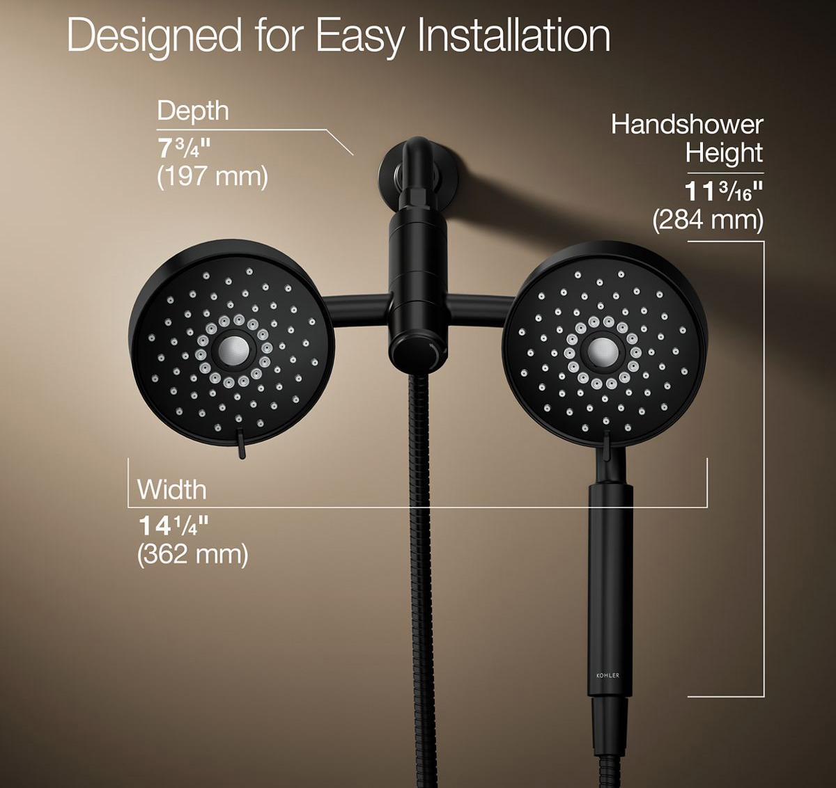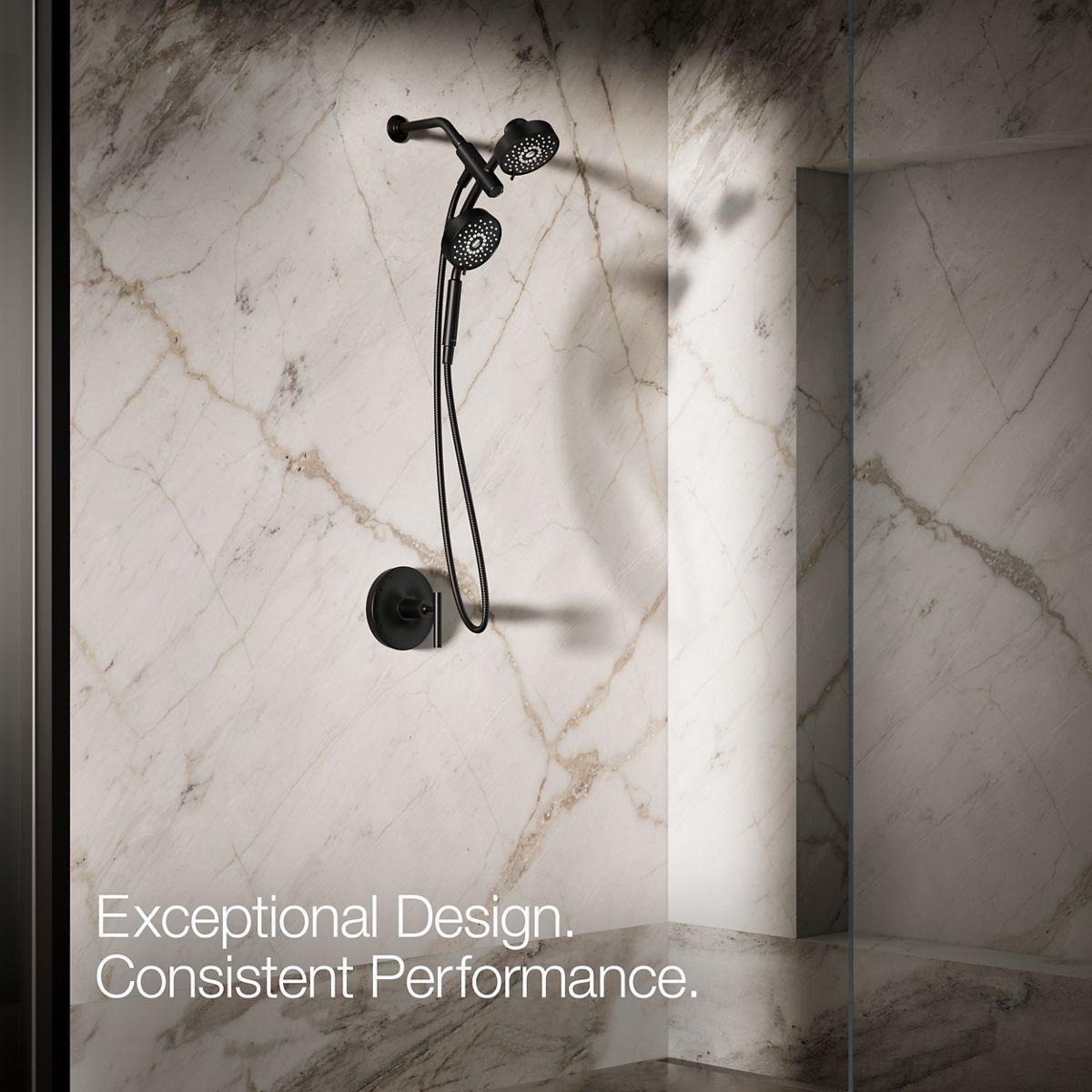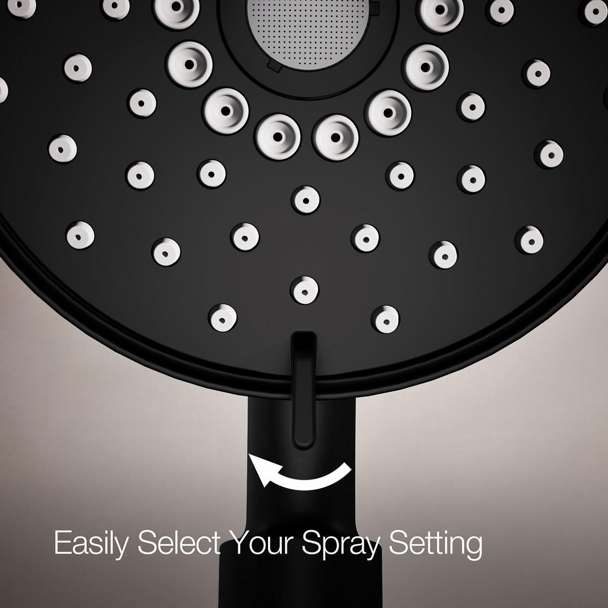 - Multifunction showerhead and handshower each have advanced spray engines to provide three experiences: full coverage, pulsating massage, and silk spray.