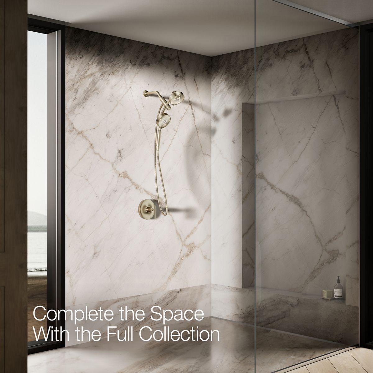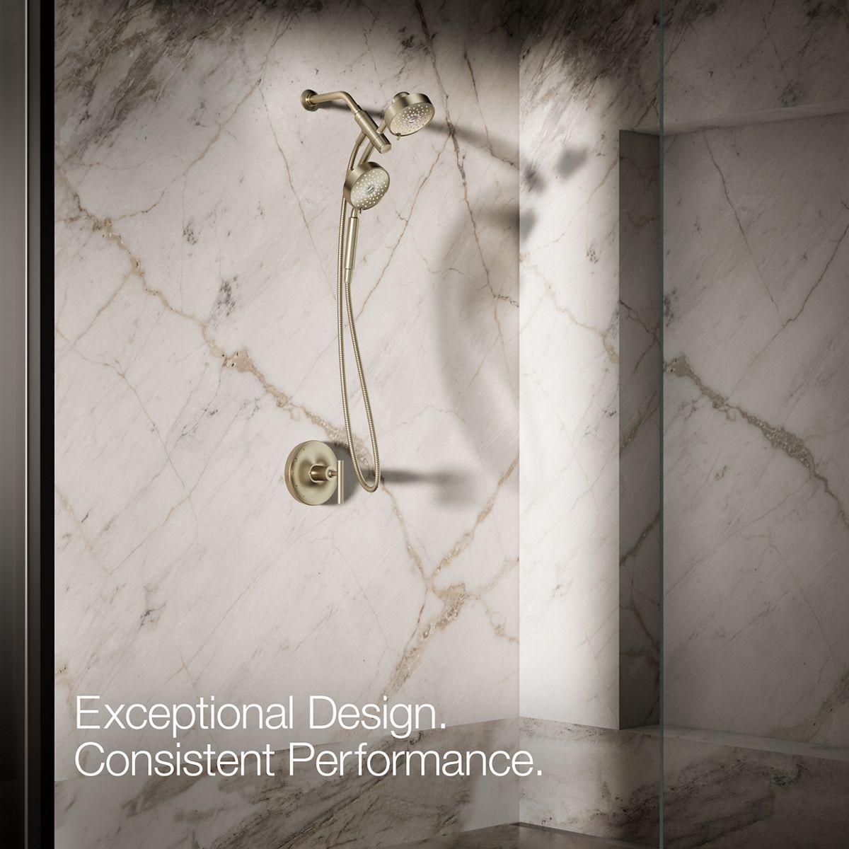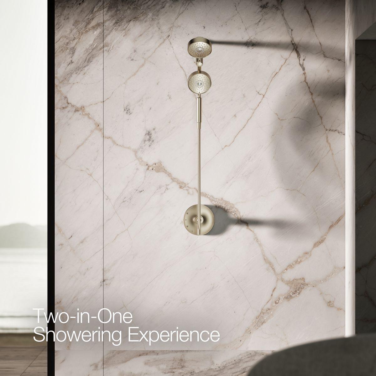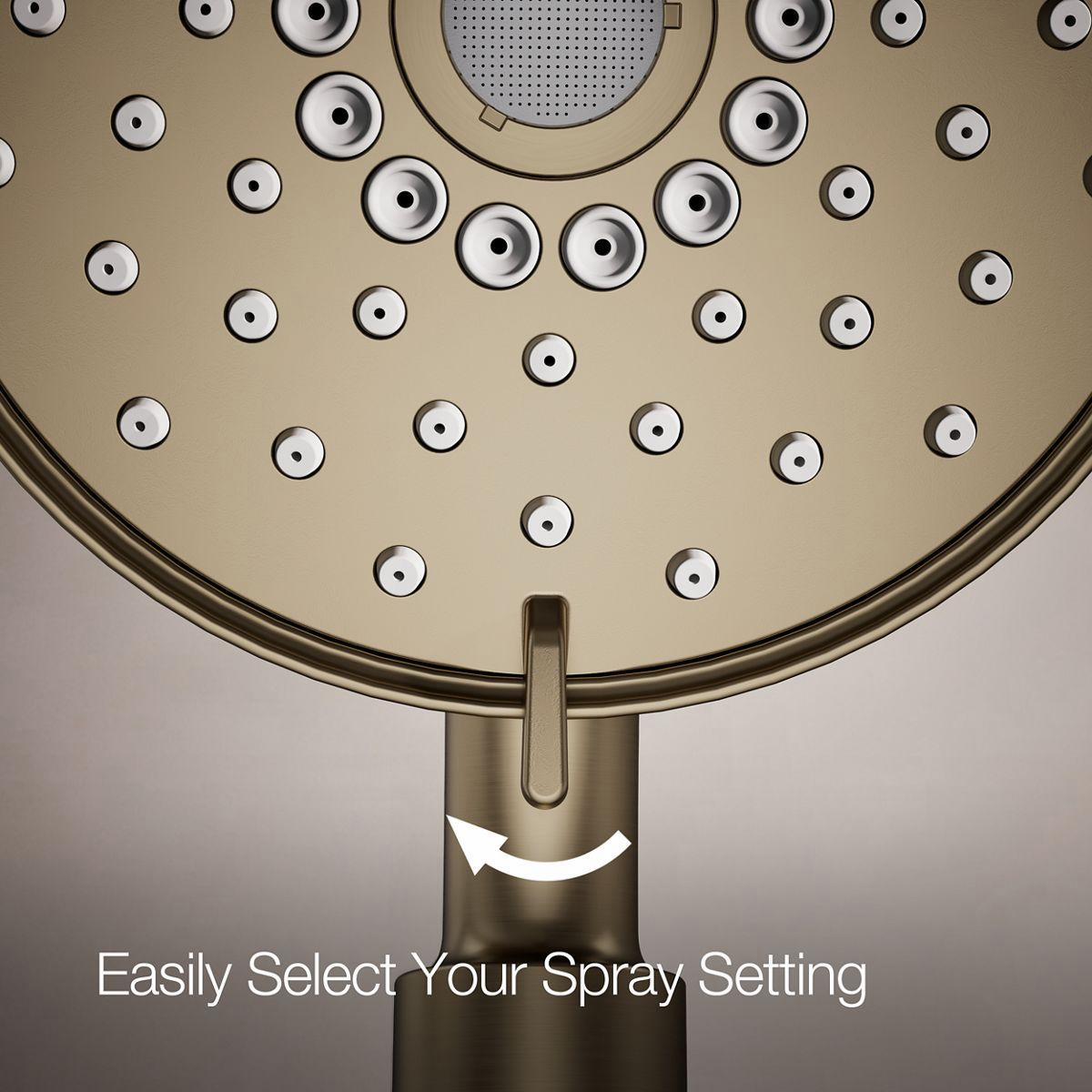 - Multifunction showerhead and handshower each have advanced spray engines to provide three experiences: full coverage, pulsating massage, and silk spray.