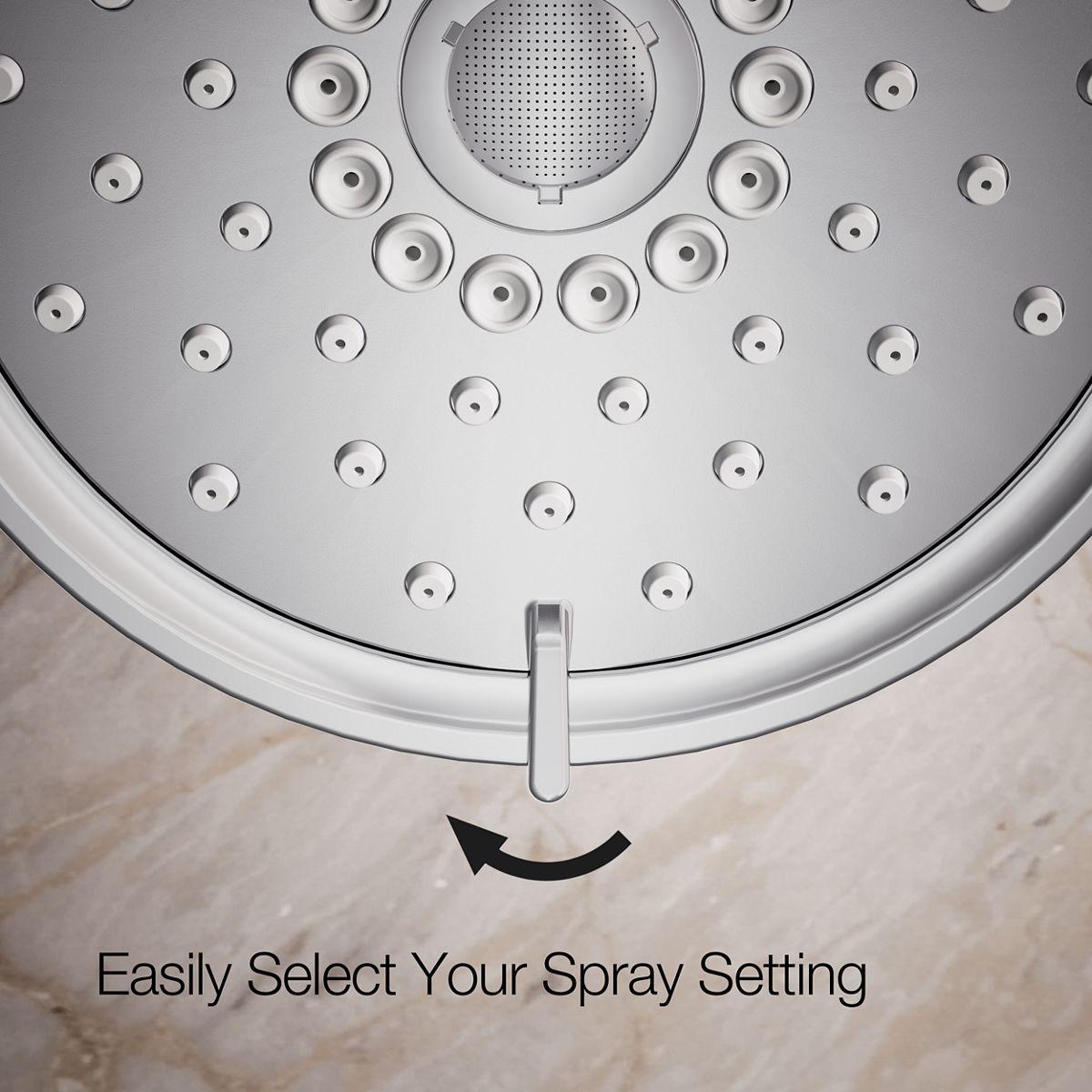 - Multifunction showerhead and handshower each have advanced spray engines to provide three experiences: full coverage, pulsating massage, and silk spray.