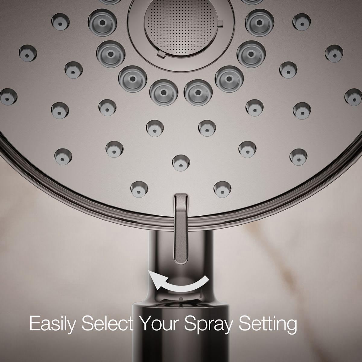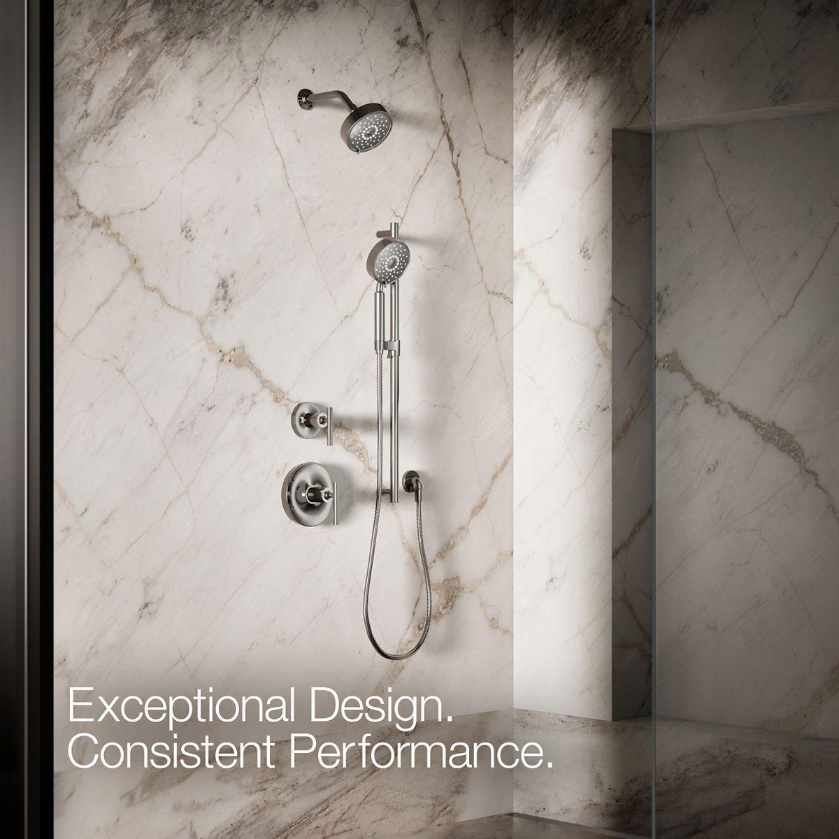 - Multifunction showerhead and handshower each have advanced spray engines to provide three experiences: full coverage, pulsating massage, and silk spray.
