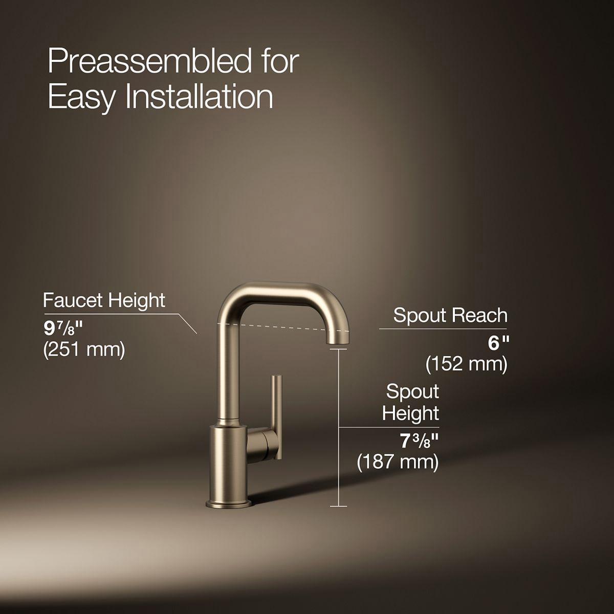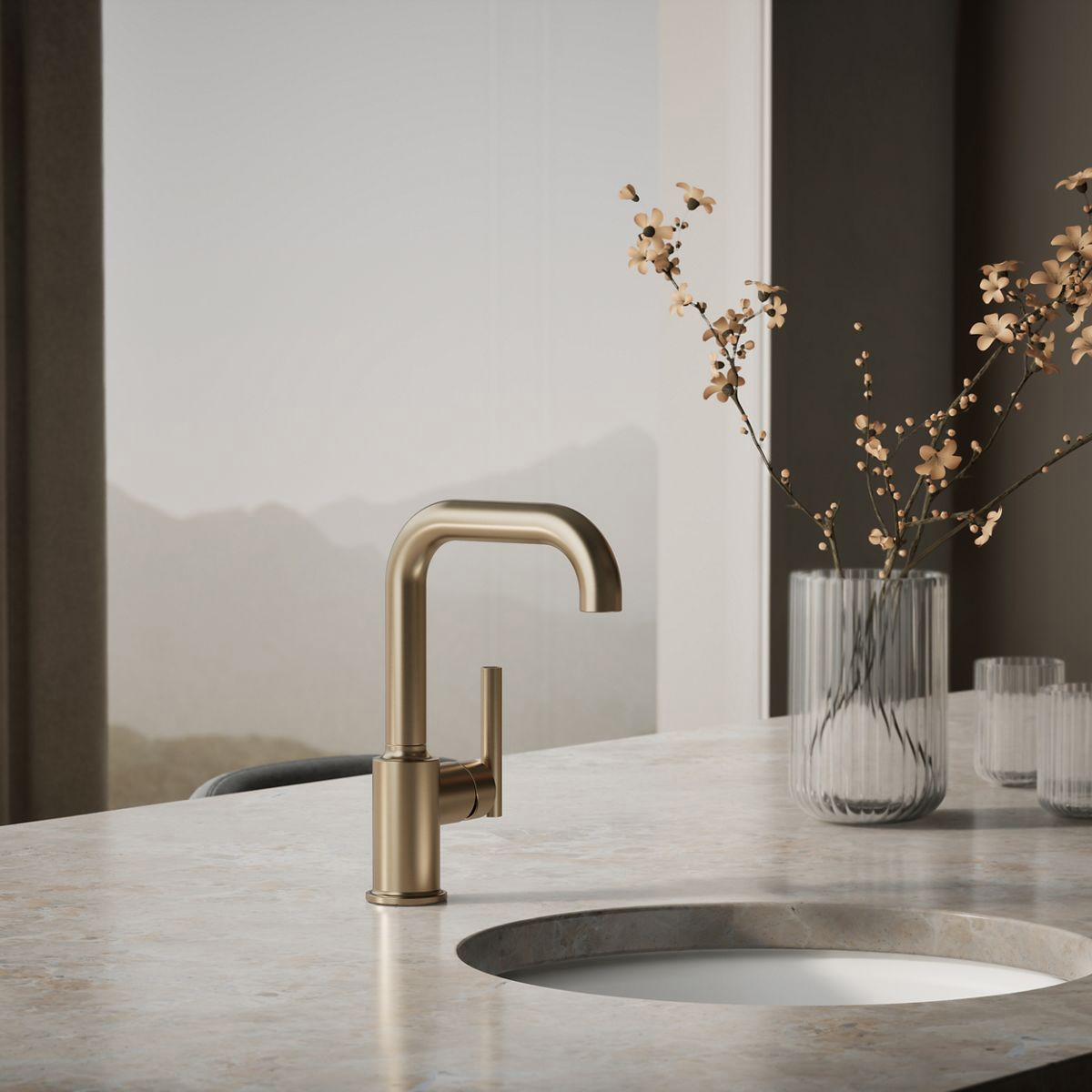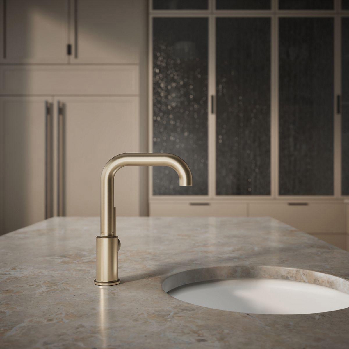 Designed to accommodate an extra-thick counter, this Purist bar sink faucet combines a strong architectural form and simple-to-use features. The high-arch swing spout maneuvers easily around large cookware, while the side lever handle controls temperature and flow. This faucet is ideal for an entertainment area, kitchen island, or prep sink.