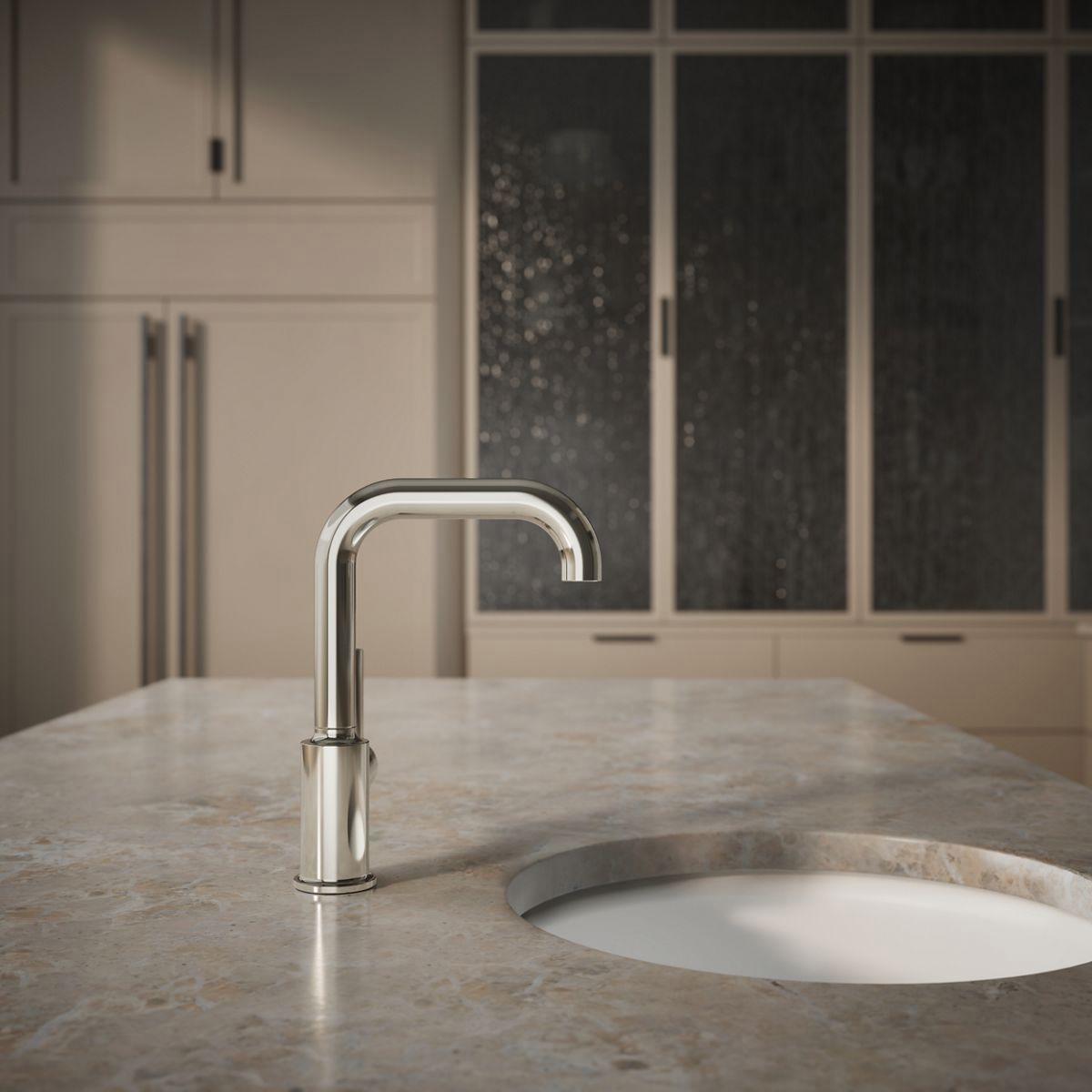 Designed to accommodate an extra-thick counter, this Purist bar sink faucet combines a strong architectural form and simple-to-use features. The high-arch swing spout maneuvers easily around large cookware, while the side lever handle controls temperature and flow. This faucet is ideal for an entertainment area, kitchen island, or prep sink.