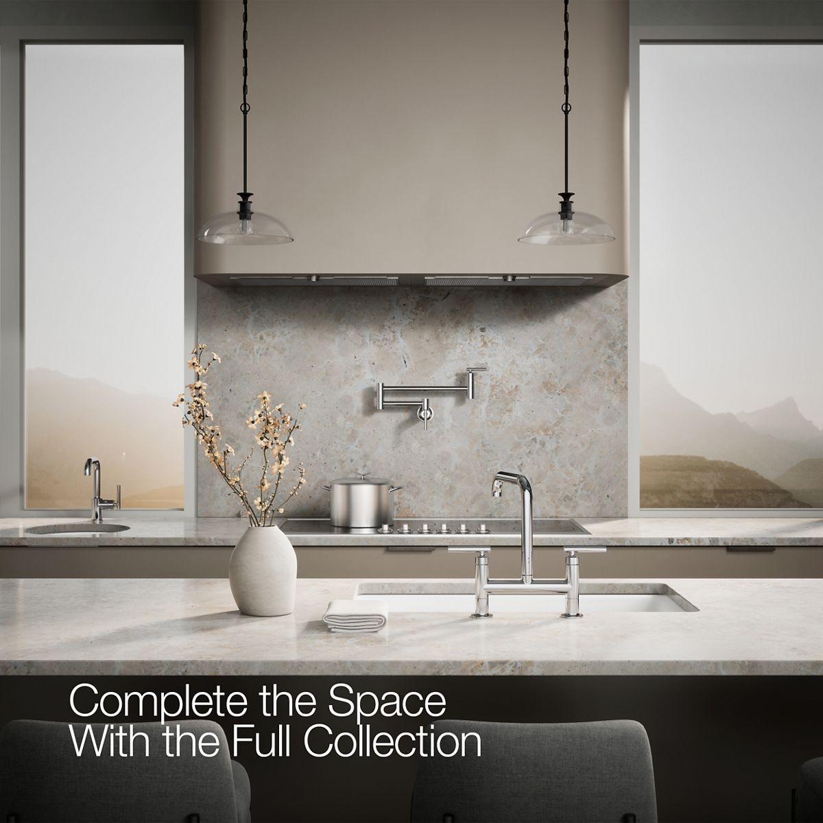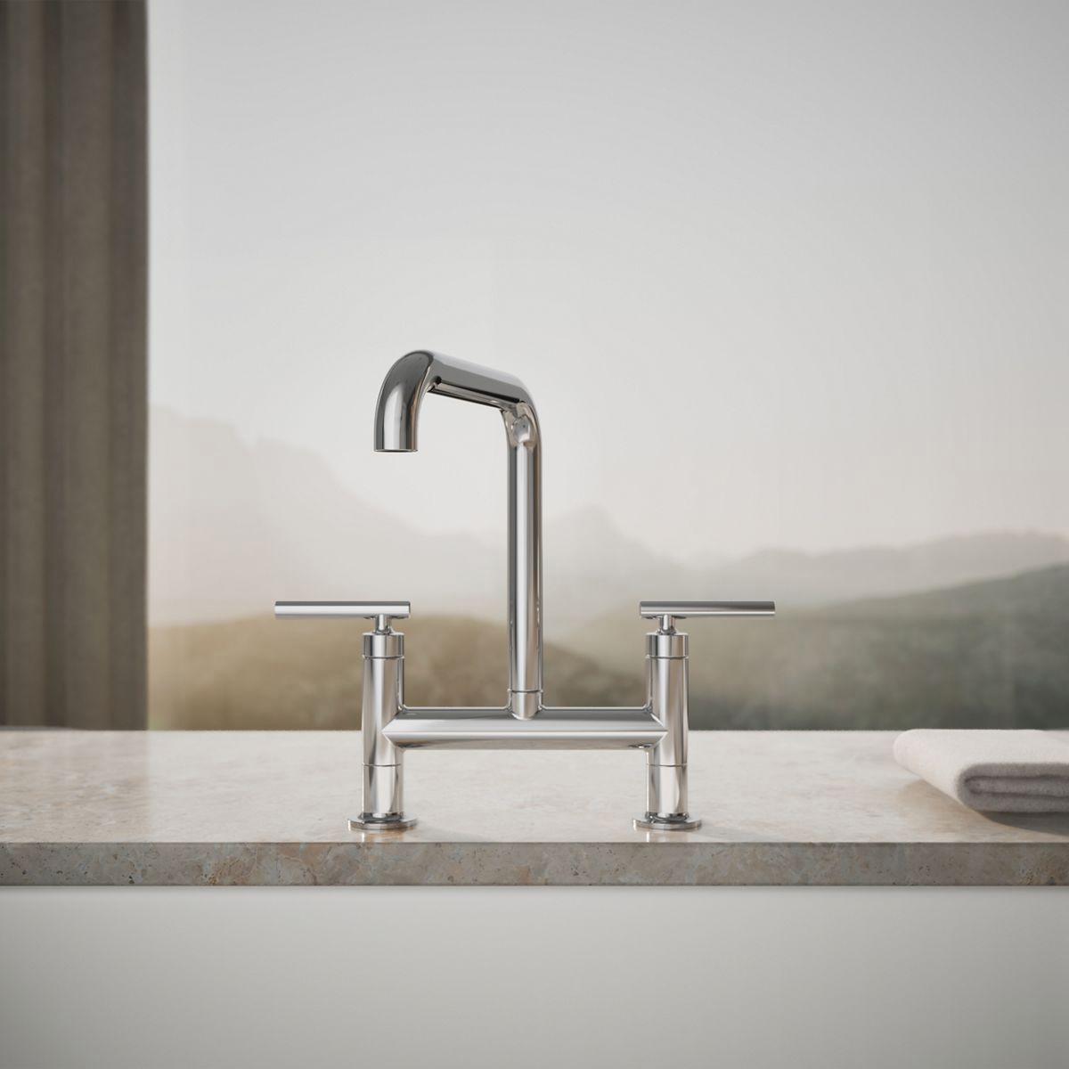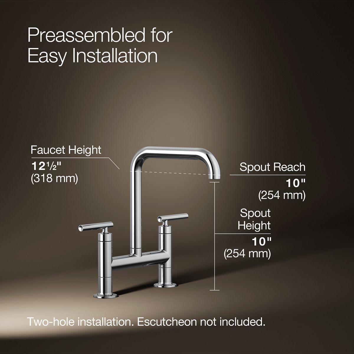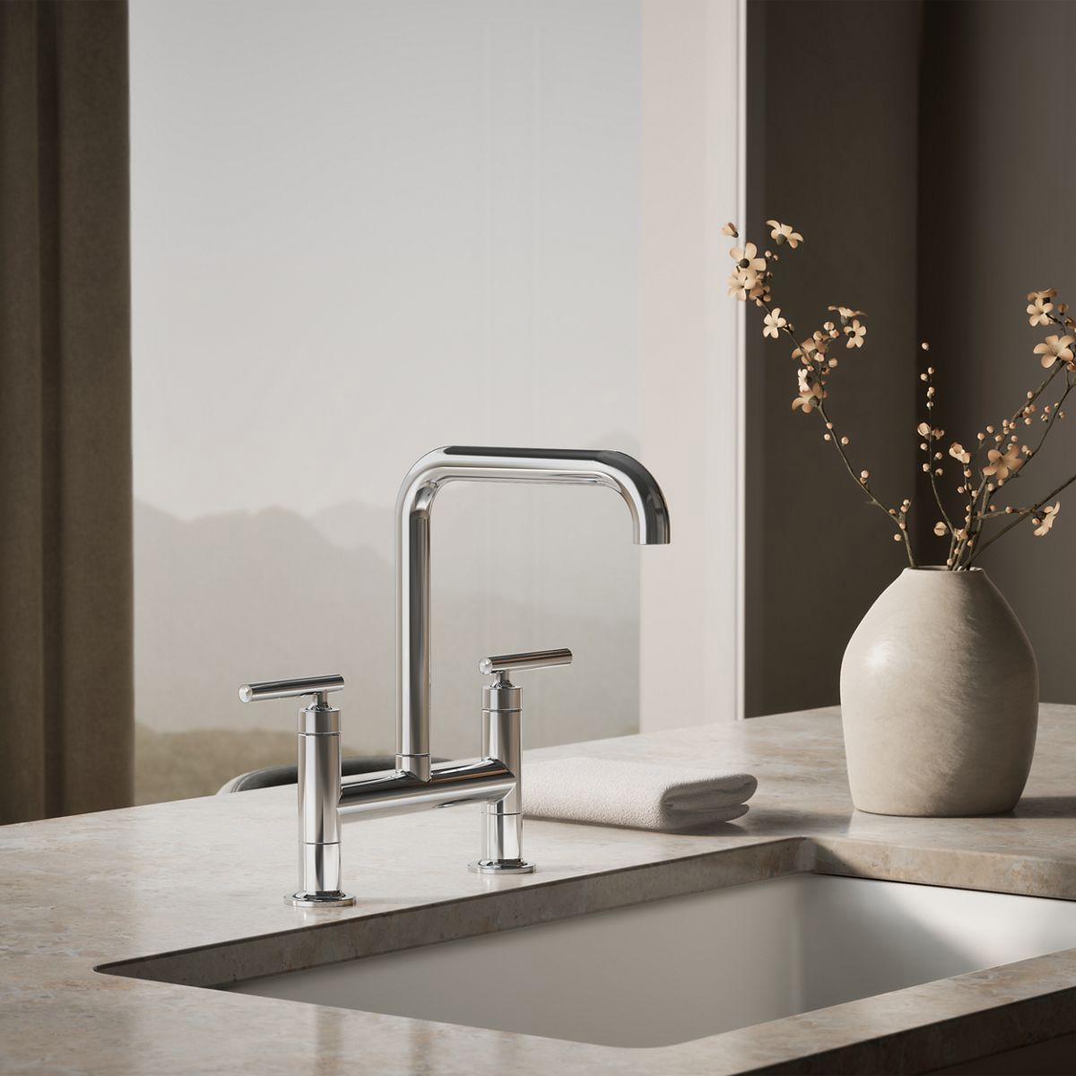 Pairing a classic bridge design with bold new touches, this Purist kitchen faucet combines distinctive modern style and easy-to-use features. The high-arch spout provides 10 inches of clearance and rotates 360 degrees, making way for your largest pots and pans. Extended lever handles offer plenty of grip area.