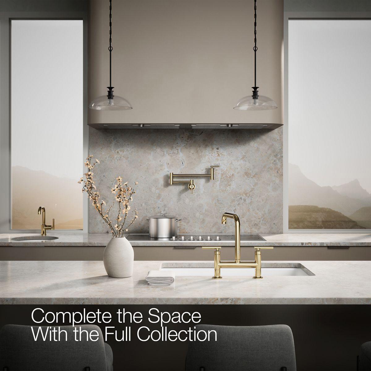 Pairing a classic bridge design with bold new touches, this Purist kitchen faucet combines distinctive modern style and easy-to-use features. The high-arch spout provides 10 inches of clearance and rotates 360 degrees, making way for your largest pots and pans. Extended lever handles offer plenty of grip area.