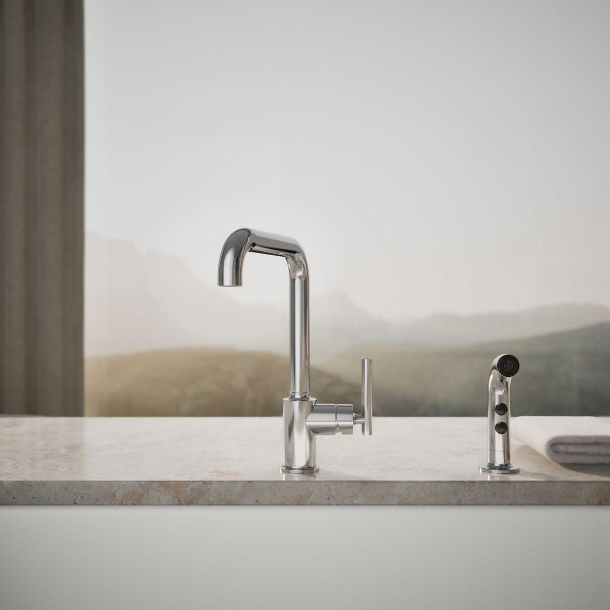 Designed to accommodate extra-thick counters, this Purist kitchen faucet combines a strong architectural form and simple-to-use features. The high-arch swing spout maneuvers easily around large cookware, while the side spray reaches down into the sink for more effective cleaning and up-close tasks.