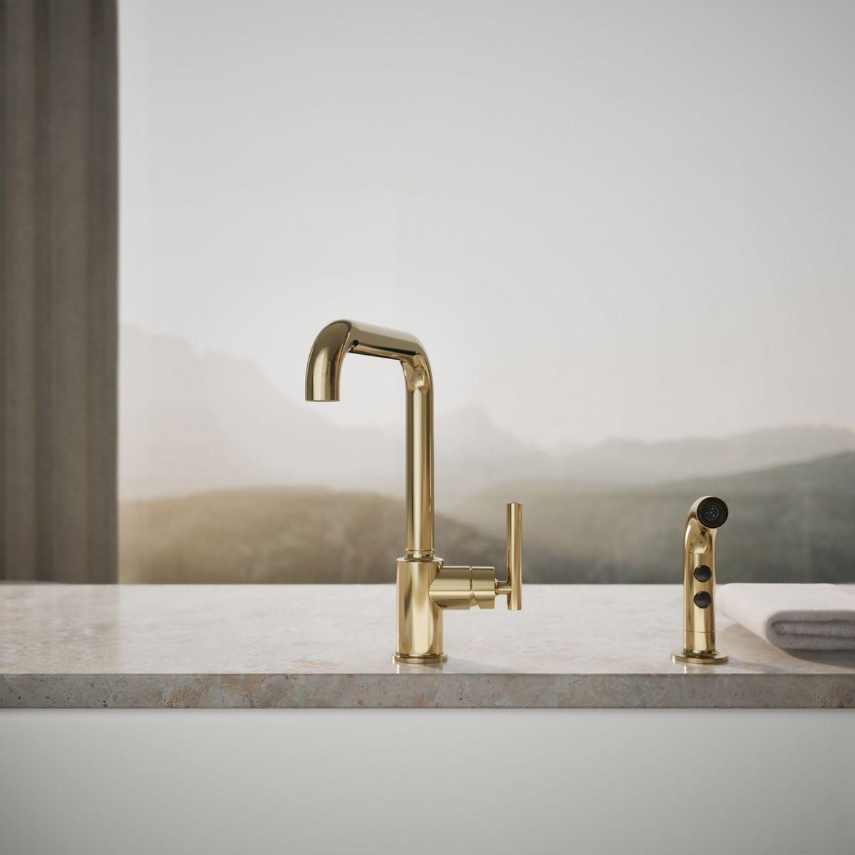 Designed to accommodate extra-thick counters, this Purist kitchen faucet combines a strong architectural form and simple-to-use features. The high-arch swing spout maneuvers easily around large cookware, while the side spray reaches down into the sink for more effective cleaning and up-close tasks.