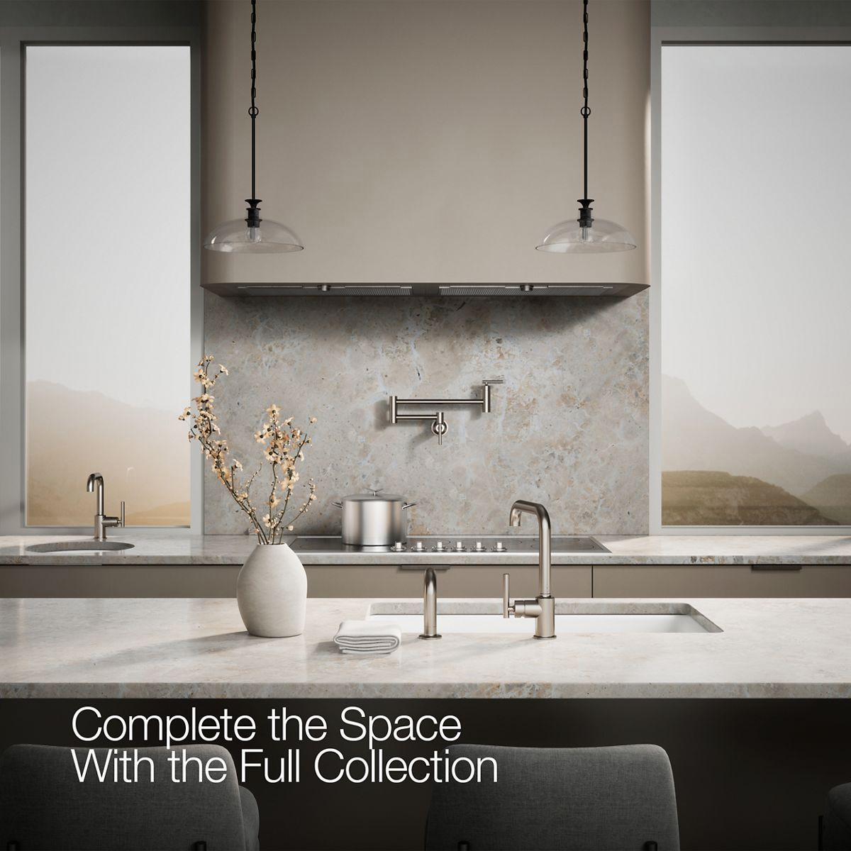 Designed to accommodate extra-thick counters, this Purist kitchen faucet combines a strong architectural form and simple-to-use features. The high-arch swing spout maneuvers easily around large cookware, while the side spray reaches down into the sink for more effective cleaning and up-close tasks.