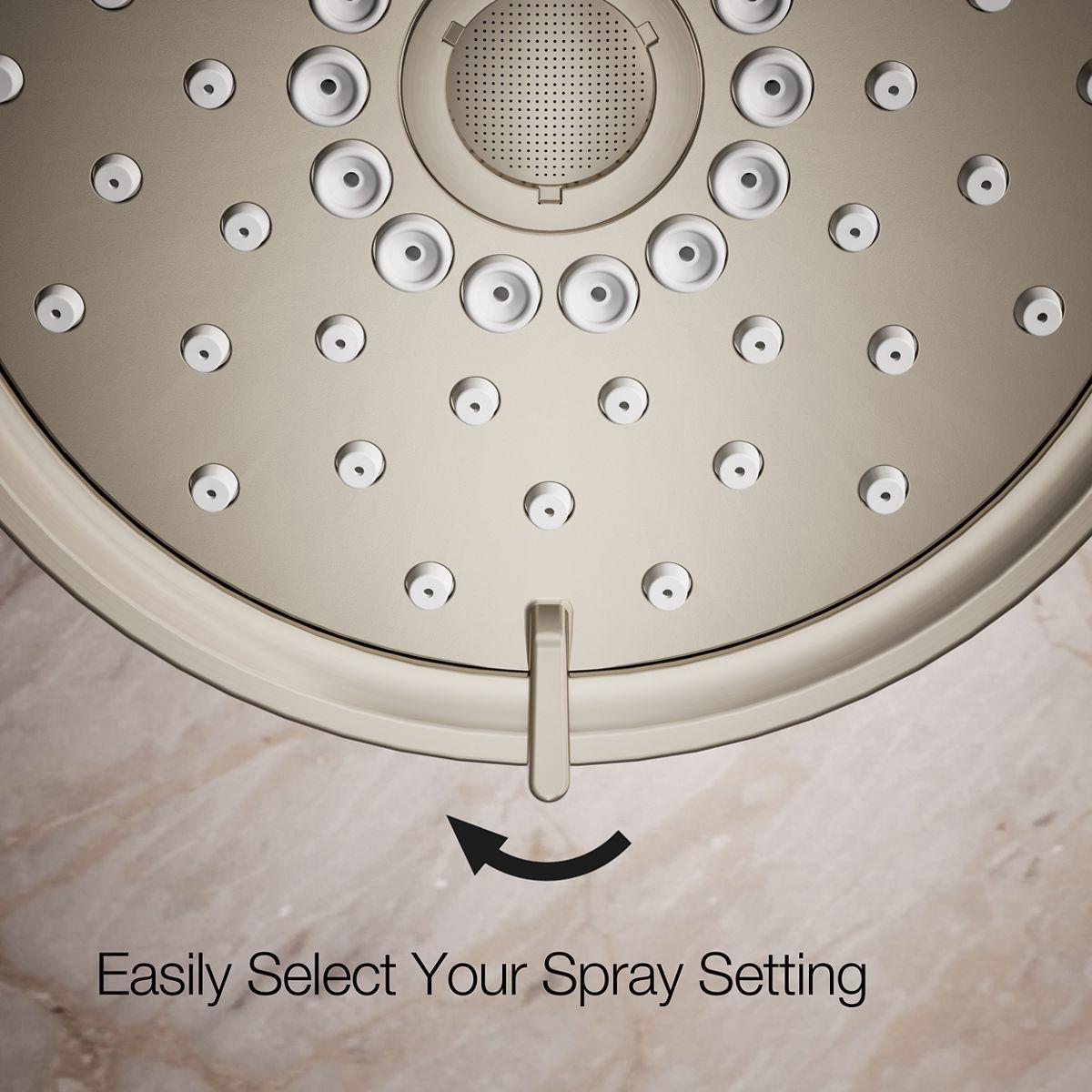 - Multifunction showerhead and handshower each have advanced spray engines to provide three experiences: full coverage, pulsating massage, and silk spray.